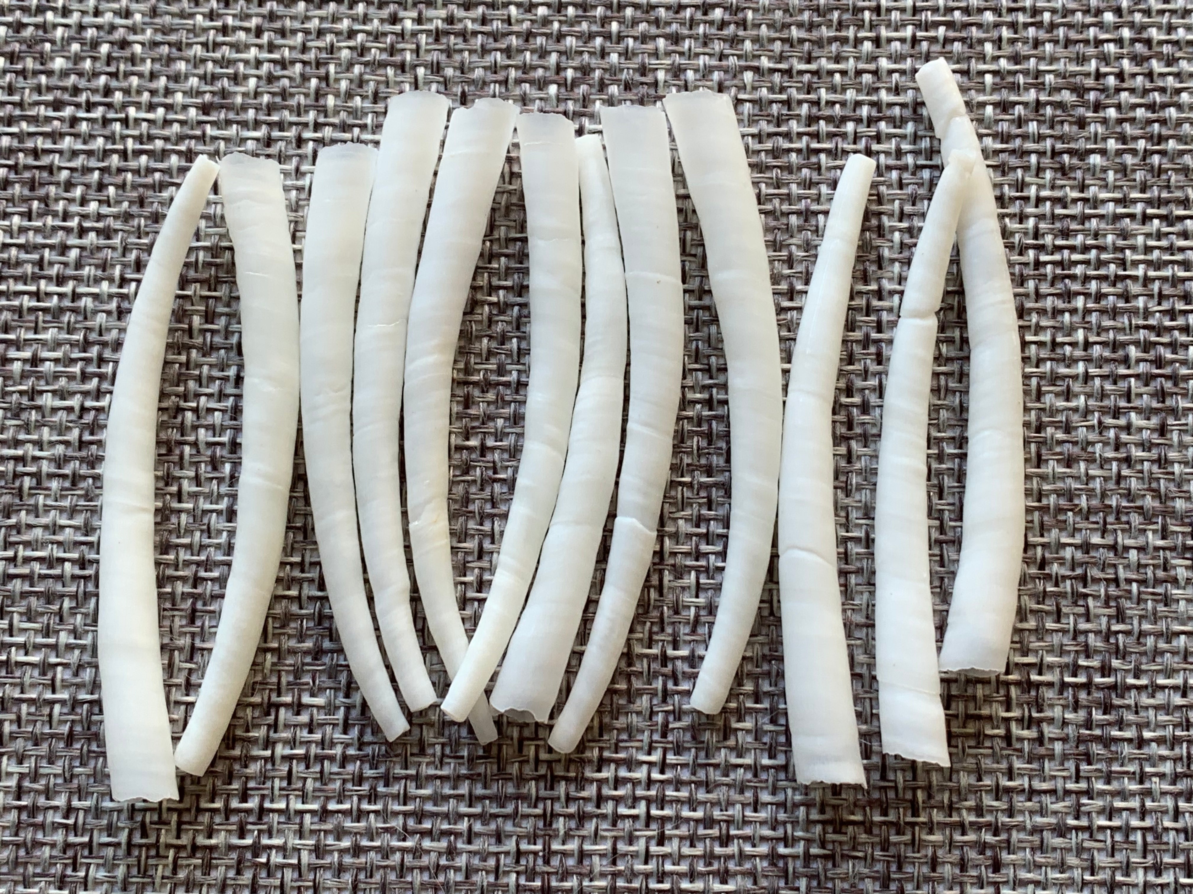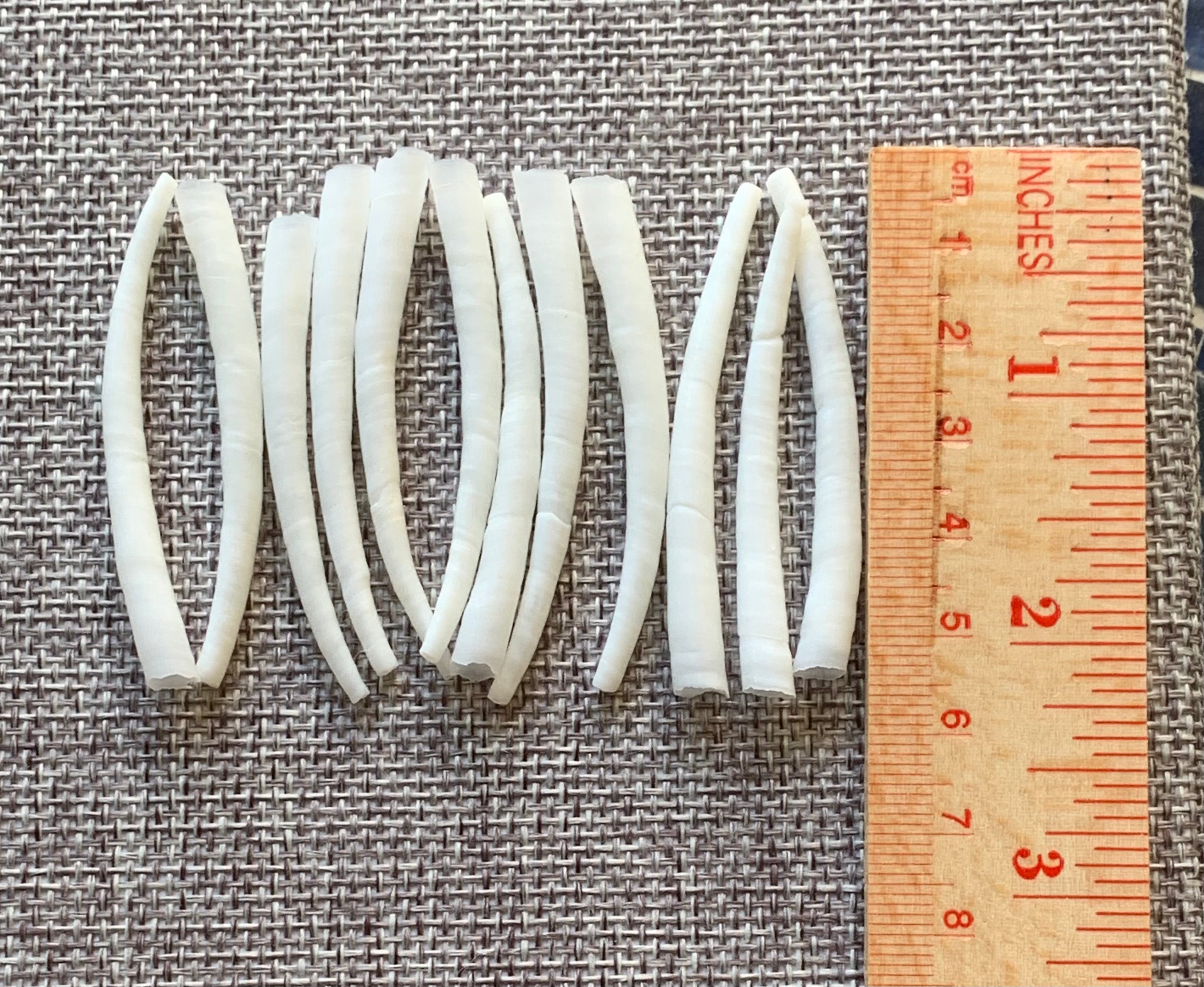 These smooth Dentalium shells are 2” to 2.25” long (5cm to 6.5cm).