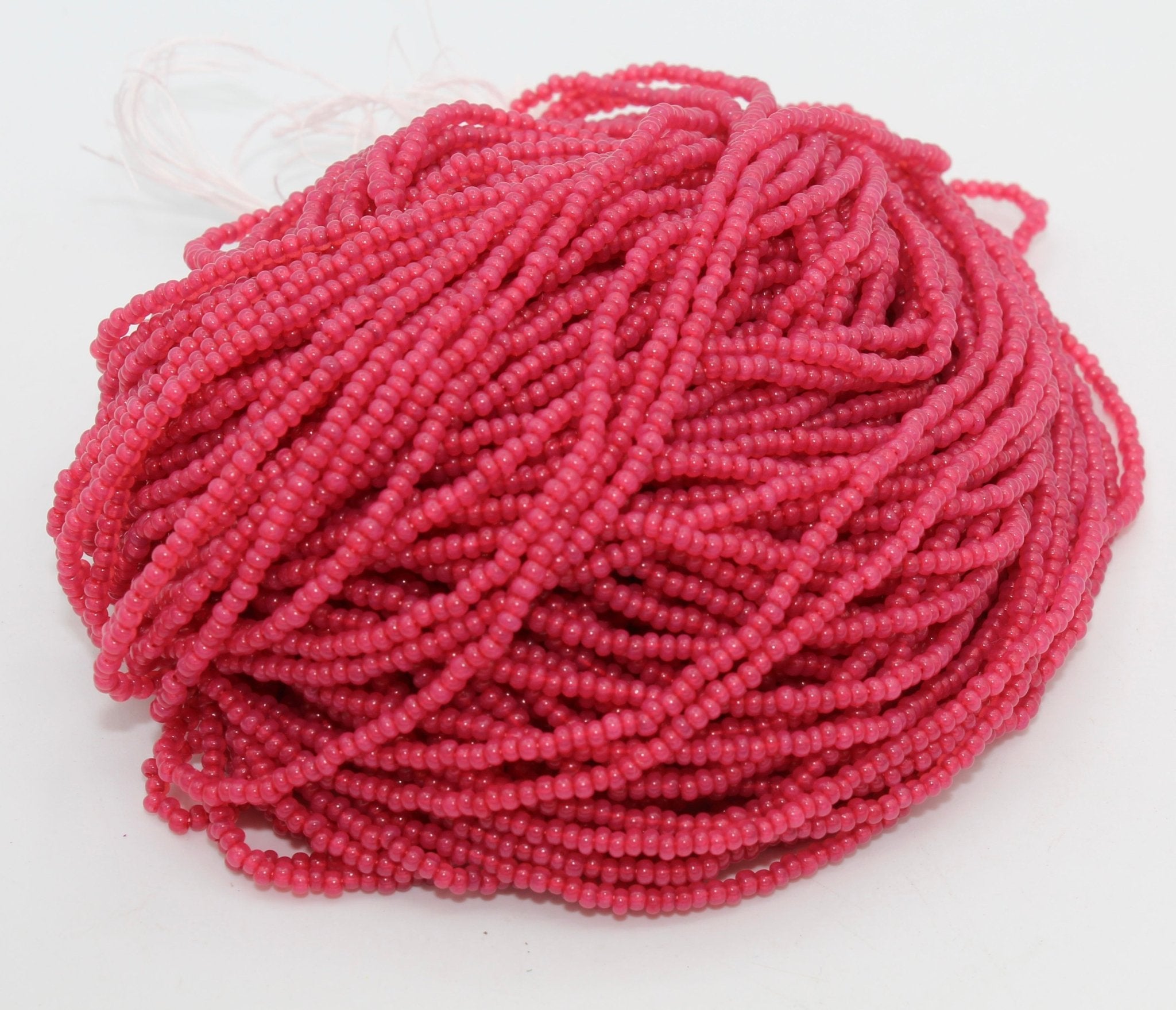 These beads are sold by the hank. Each hank has 12 strands with a total of approximately 4,000 beads. Lined up on a needle, roughly 17 beads = 1 inch (25mm).