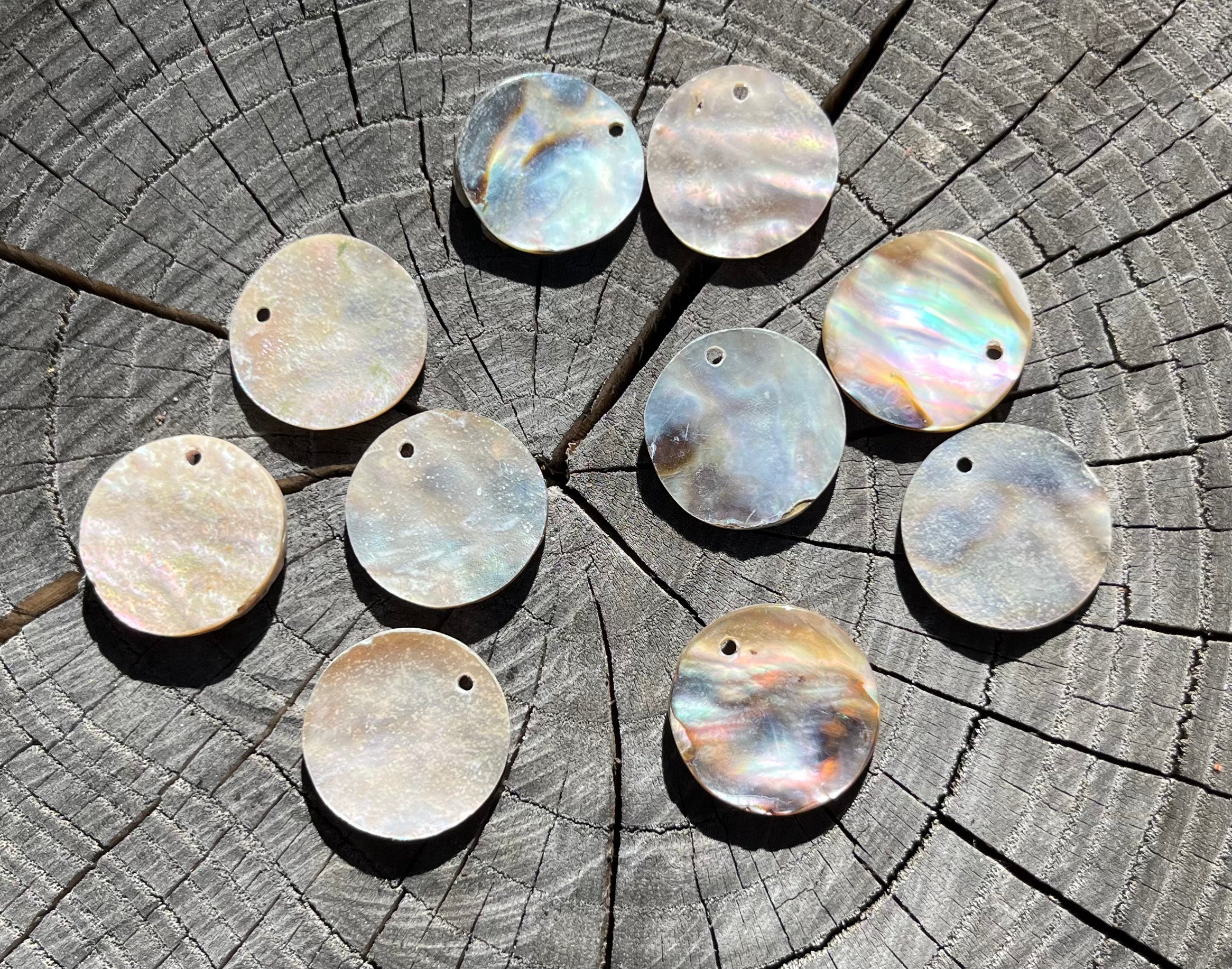 These abalone discs have 1 hole. They are sold with a diameter of 3/4” or 1", and are good for pendants or earrings.