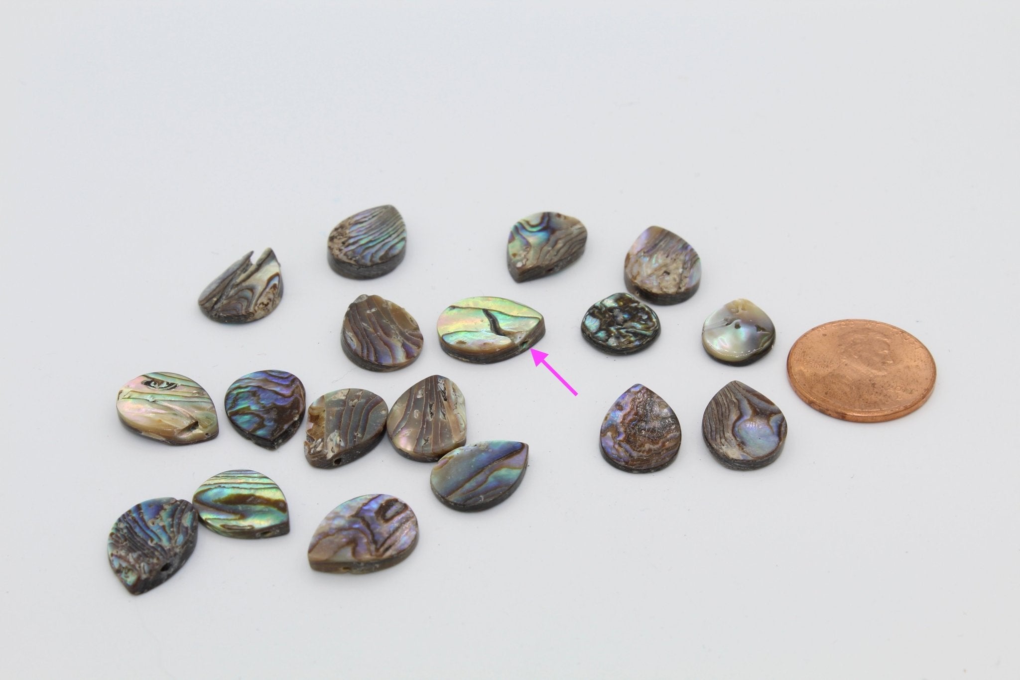 These beautiful Abalone teardrop beads are most often used in earrings and bead embroidery. They have one hole drilled horizontally across the top of the teardrop (see arrow in second picture).