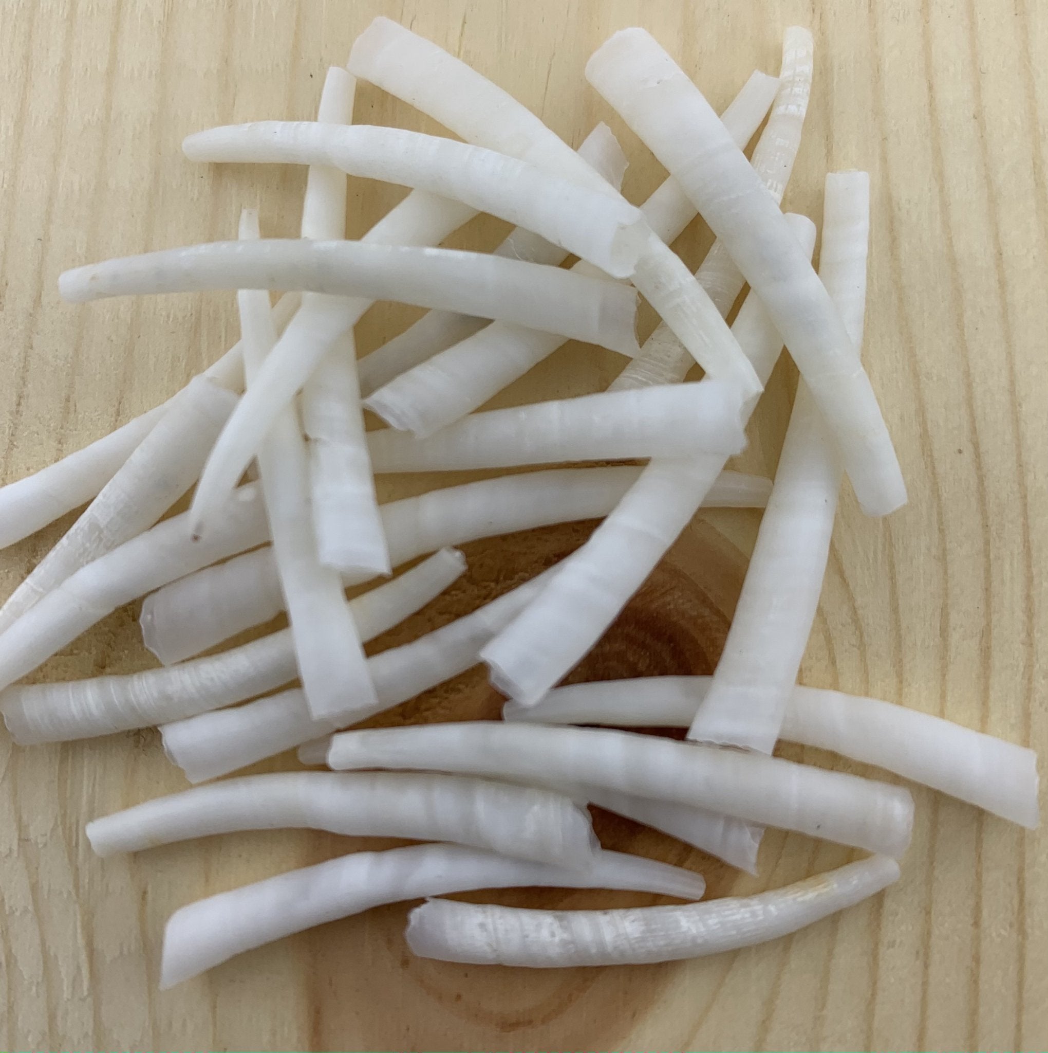 These dentalium shells are short (.5” to 1”" in length) and sold in bags of 10 grams (approximately 60) shells.