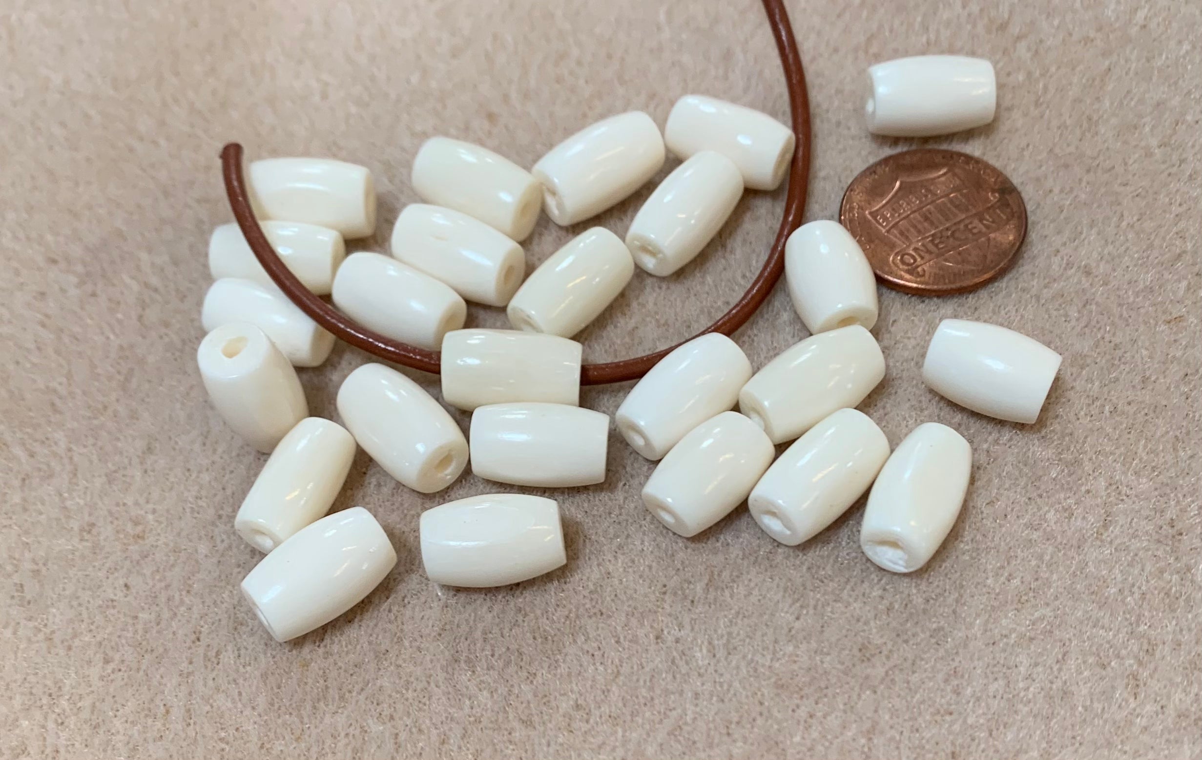 These bone beads (known as hair pipe) are 1/2”(12mm) long and are thick walled. A 2mm cord fits through the hole.