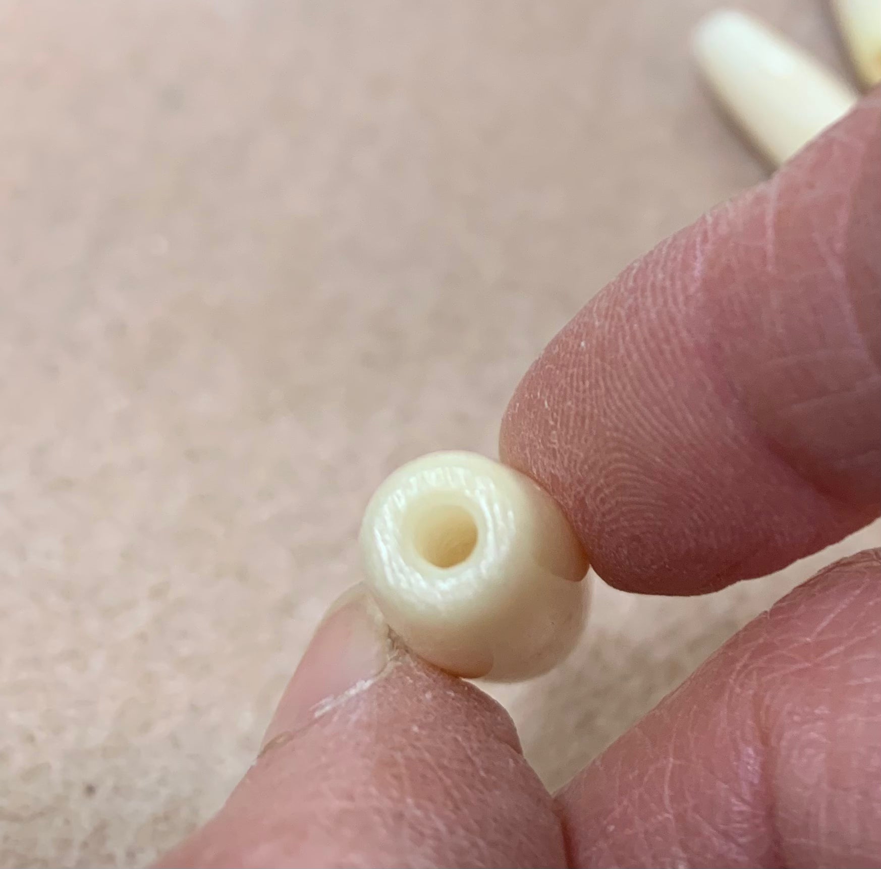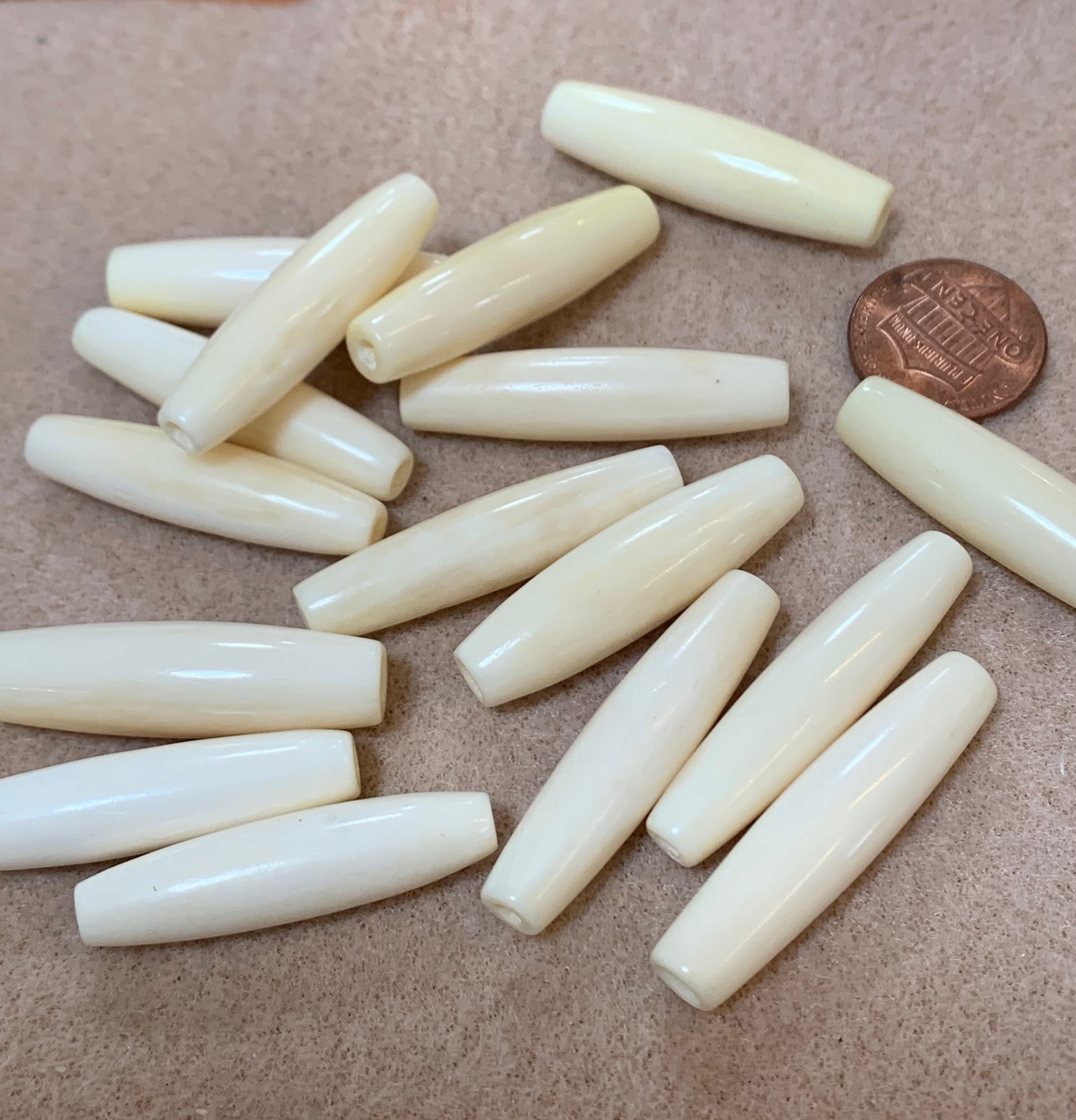 These bone beads (known as hair pipe) are 1.5” (38mm) long and are thick walled. A 2mm cord fits through the hole.