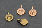 These adorable charms are made of brass and are round with an engraved lotus. There is a 2mm bail at the top of the charm for attaching it to jewelry