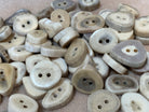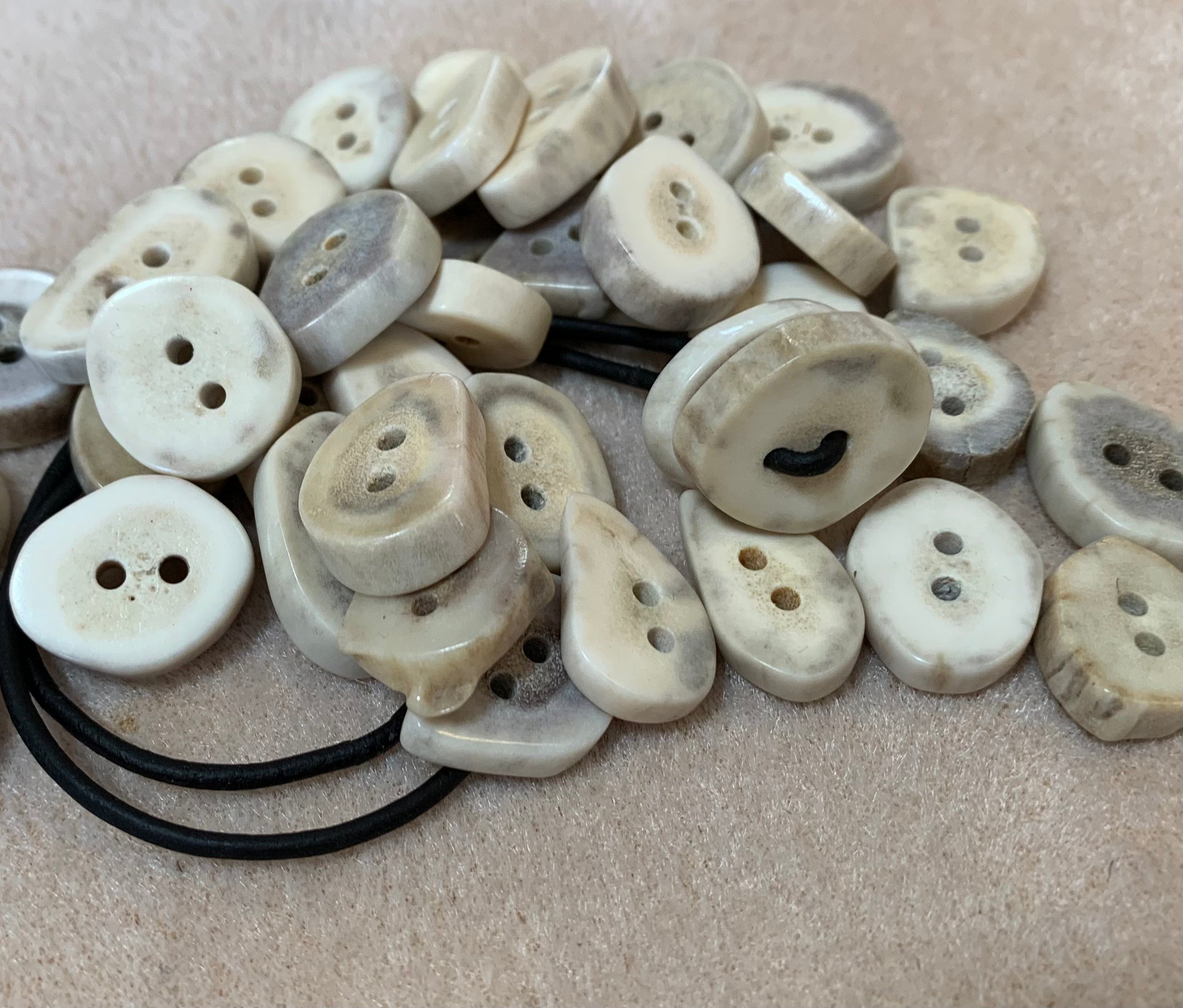 These deer antler buttons are highly polished with smooth surfaces and edges. They each have 2 holes large enough for 1.5mm cord (see picture).