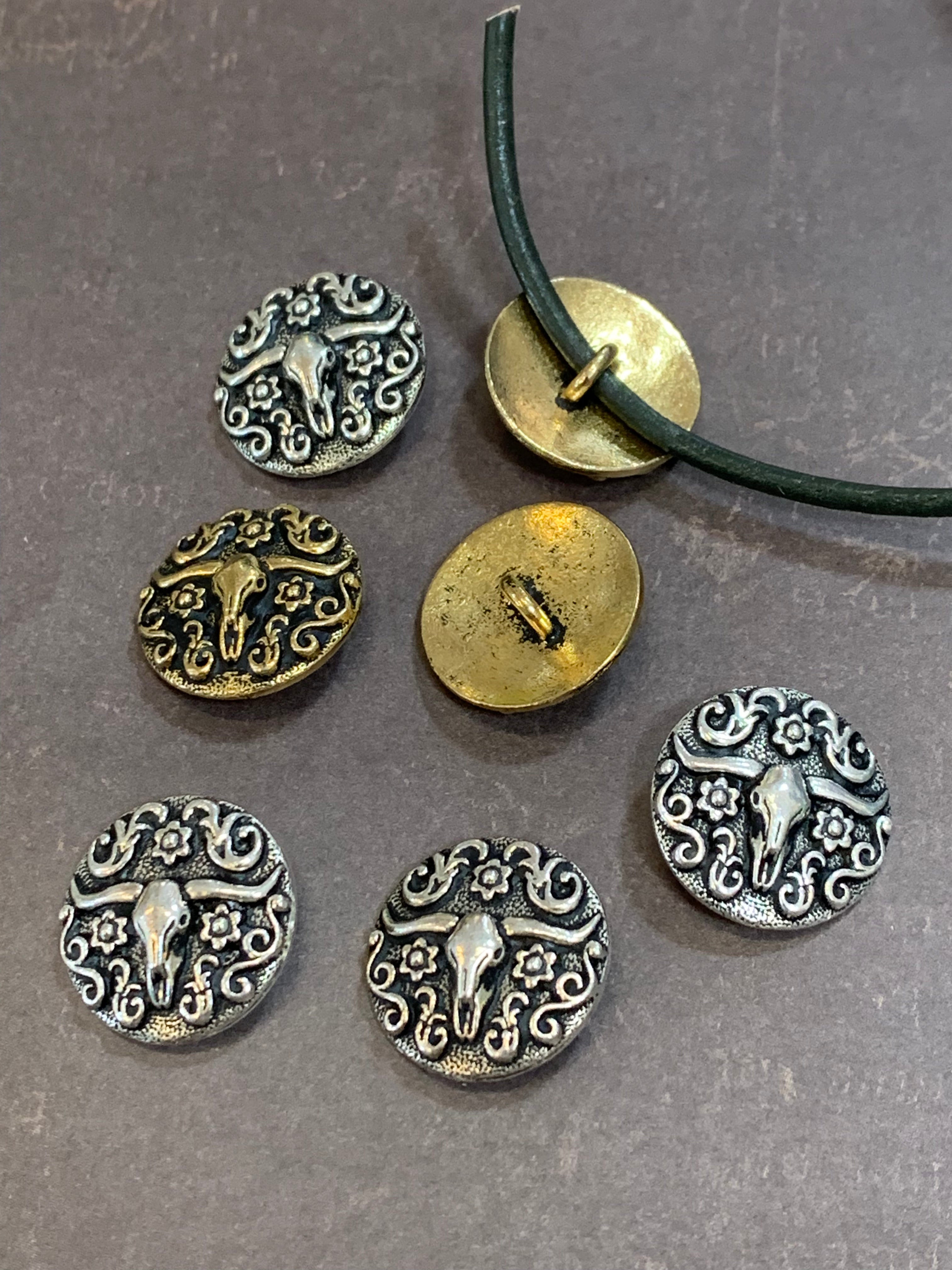 These buttons are made by Tierra Cast from lead free pewter. We have them in two finishes: antique silver and brass.