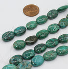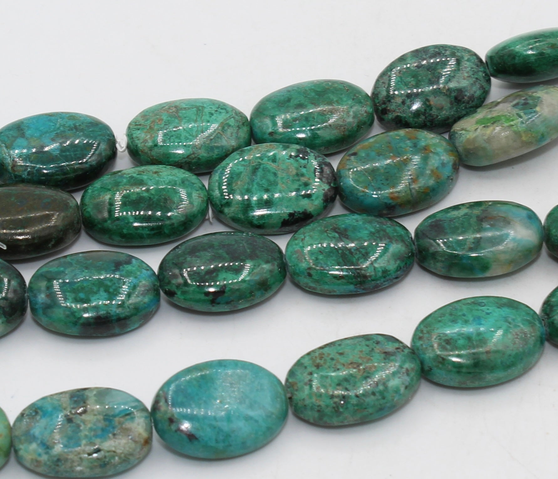 These Chrysoprase beads will lend any beading project a southwestern flair. These beads have a rich blue green color with dark copper veins. They are approximately 15mm x 8mm (1/2" x 3/8") each, and 3mm high when laid flat. The hole is 1mm.