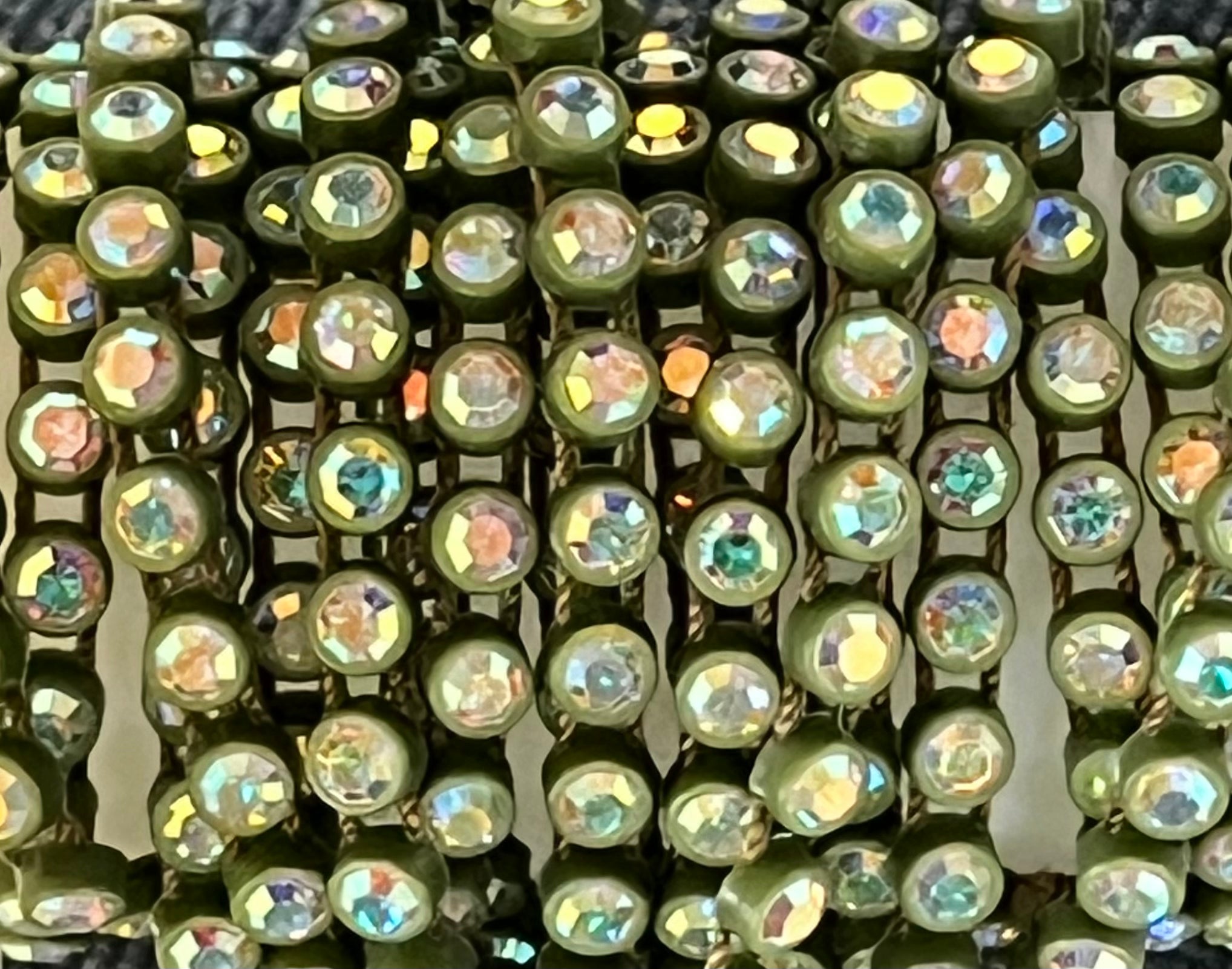 This crystal banding is size SS13 (4mm crystals). It has crystal AB crystals set in olive green banding.