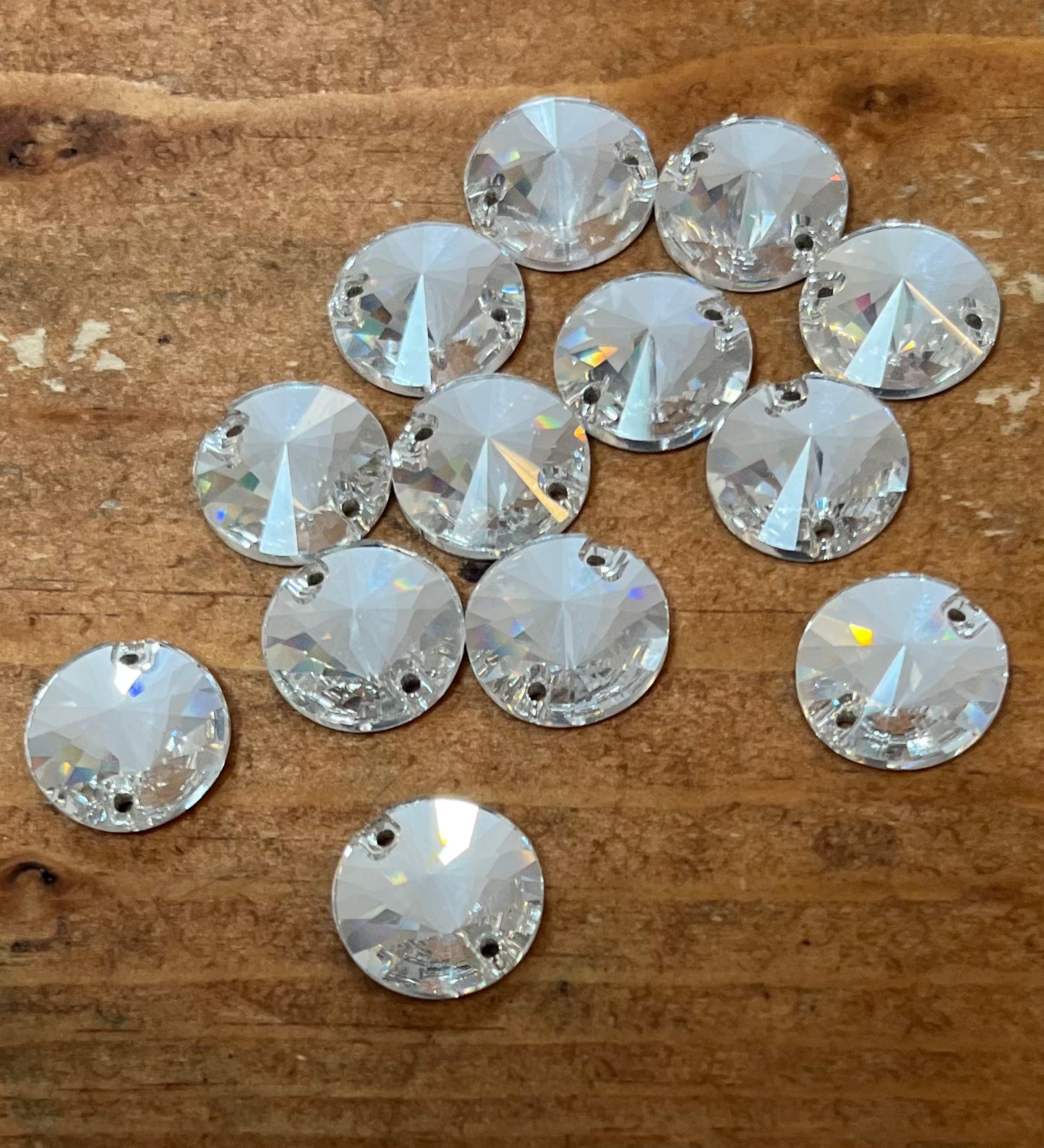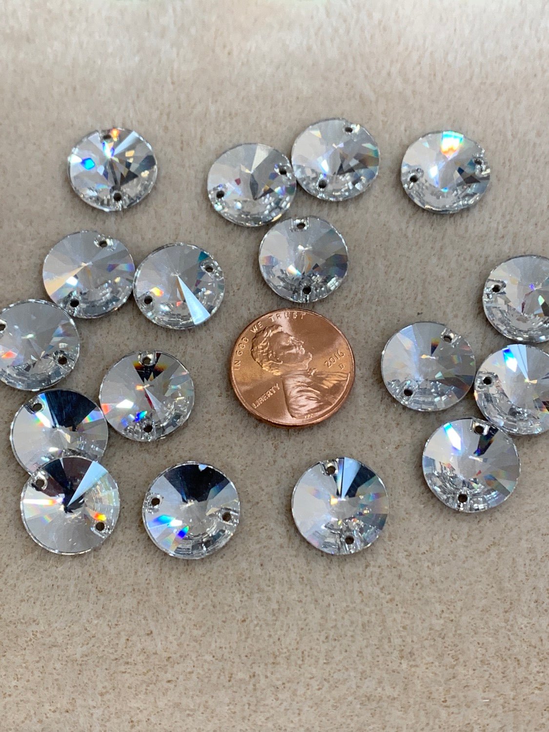 These Preciosa crystal flat backs are 14mm rounds. They have two holes and a silver foil backing. They are clear crystal. They are often used as the center of earrings.