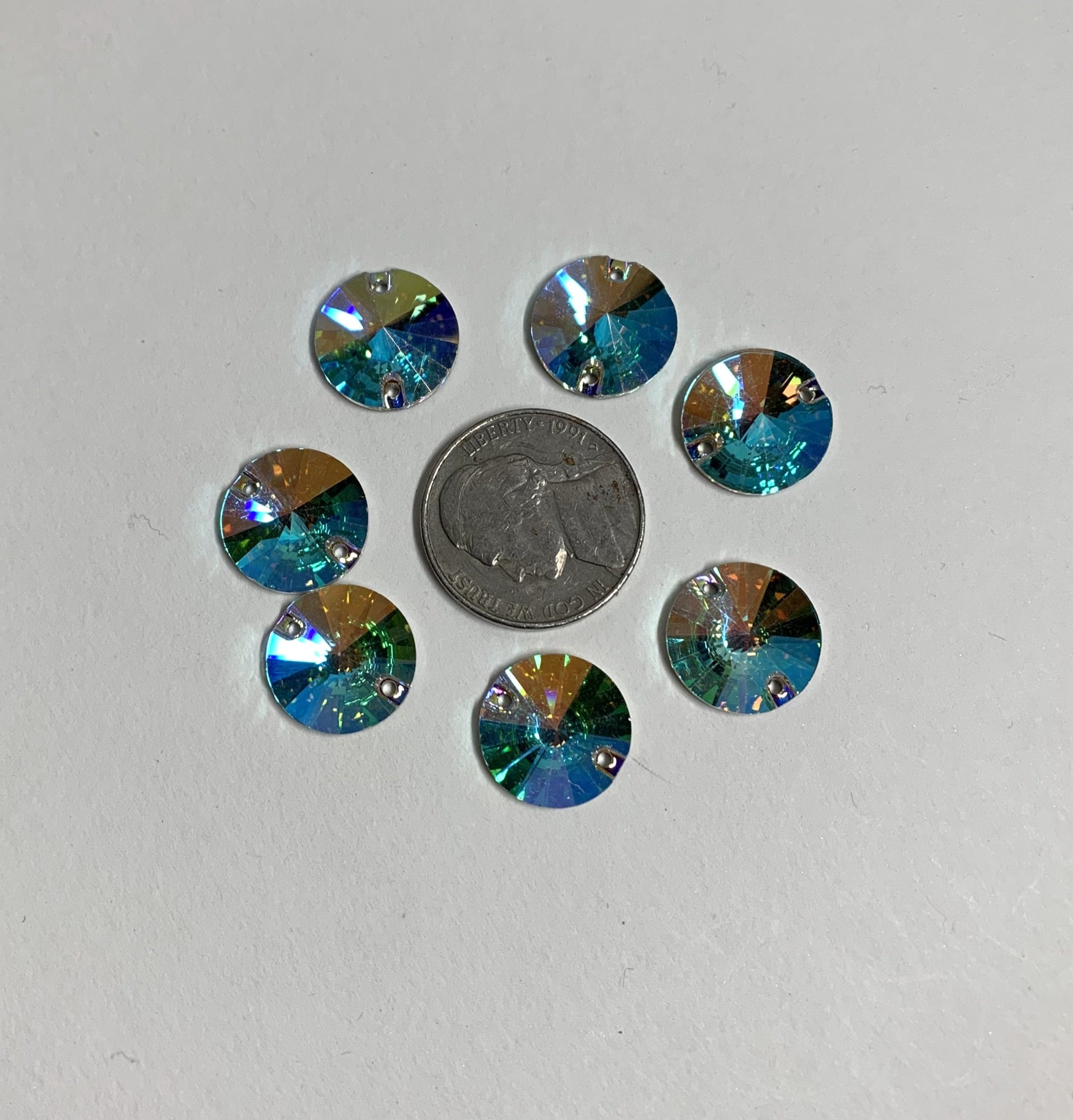 These Preciosa crystal flat backs are 14mm rounds. They have two holes and a silver foil backing. They are clear crystal with an AB coating. They are sold individually.