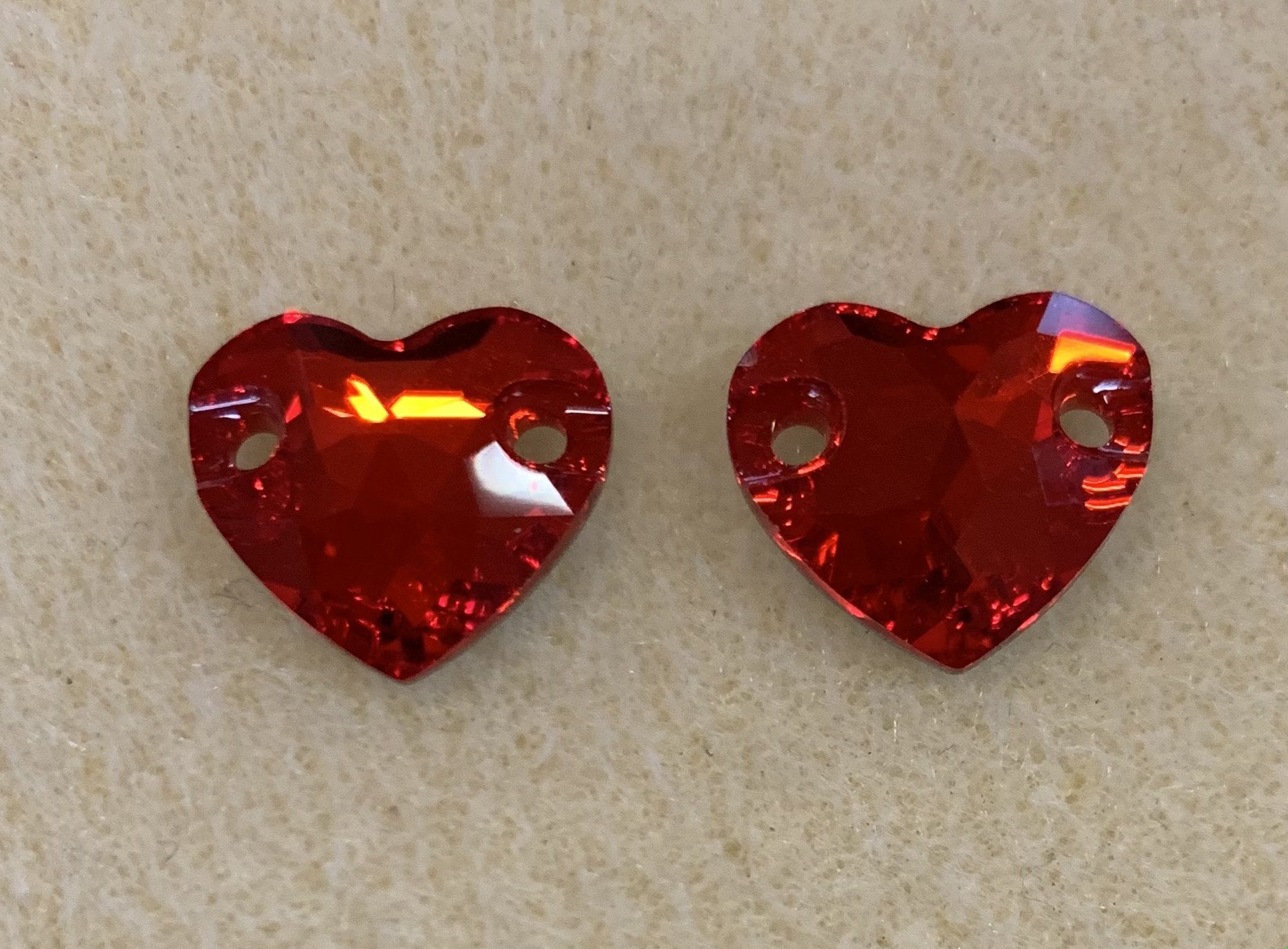 These Swarovski crystal hearts have two holes, one on each side of the heart for easy sew down application. They are 12mm x 12mm (1/2" x 1/2") (measured at the high point of each heart) and are light siam.