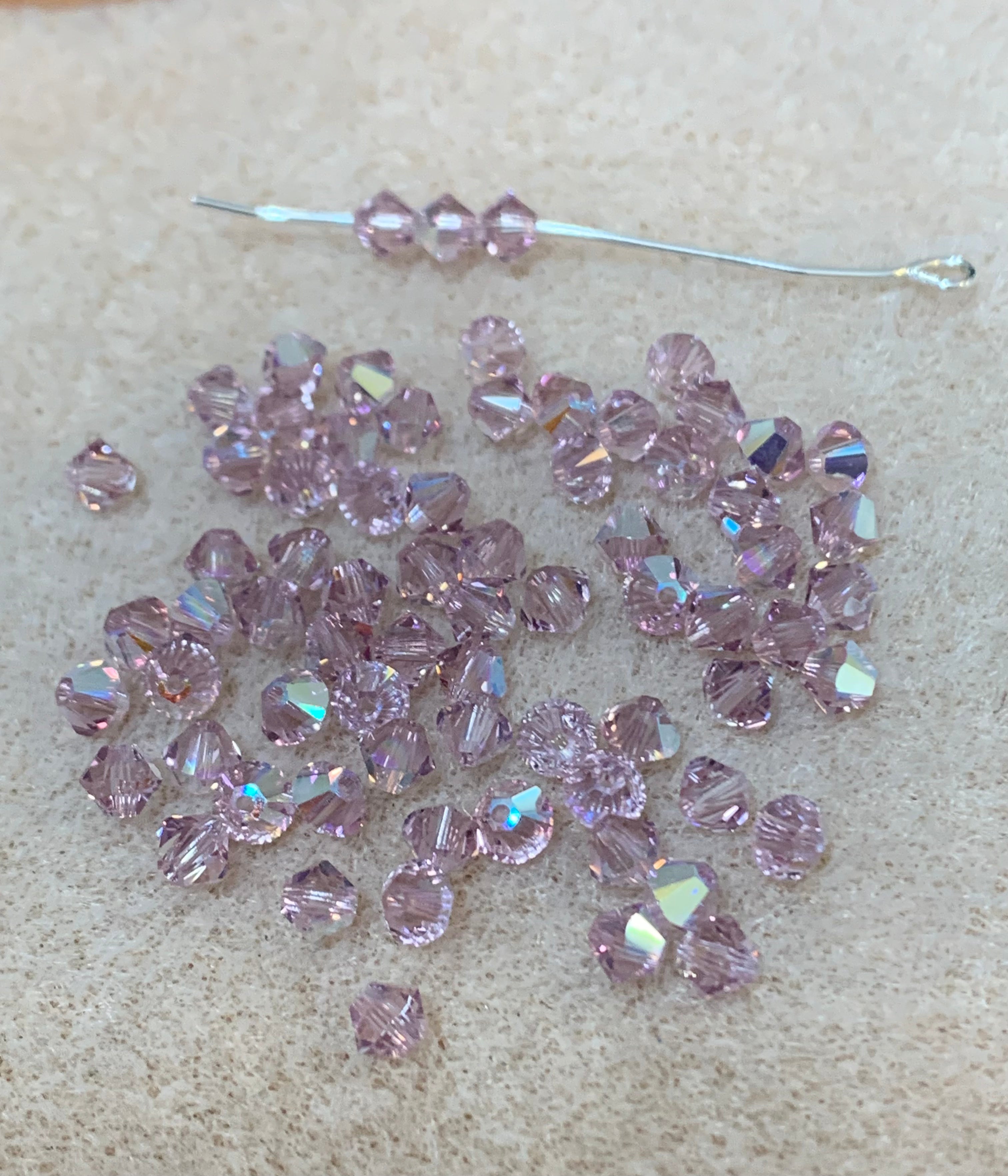 These Swarovski Crystal bicones are light amethyst AB. They are sold in a 1/2 gross package (72 beads).
