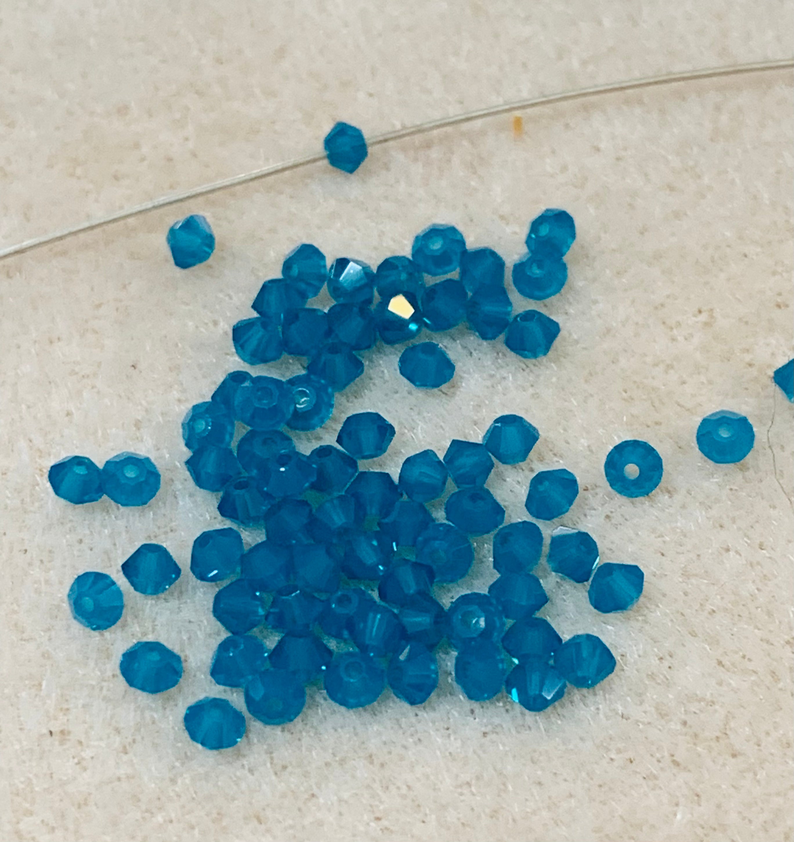 These Swarovski Crystal bicone beads are 3mm. They are sold in a 1/2 gross package (72 beads).