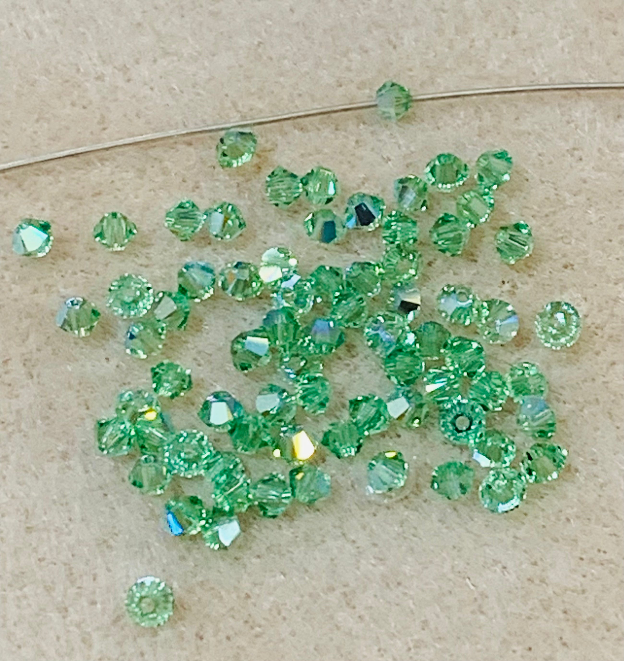 These Swarovski Crystal bicone beads are 3mm. They are sold in a 1/2 gross package (72 beads).