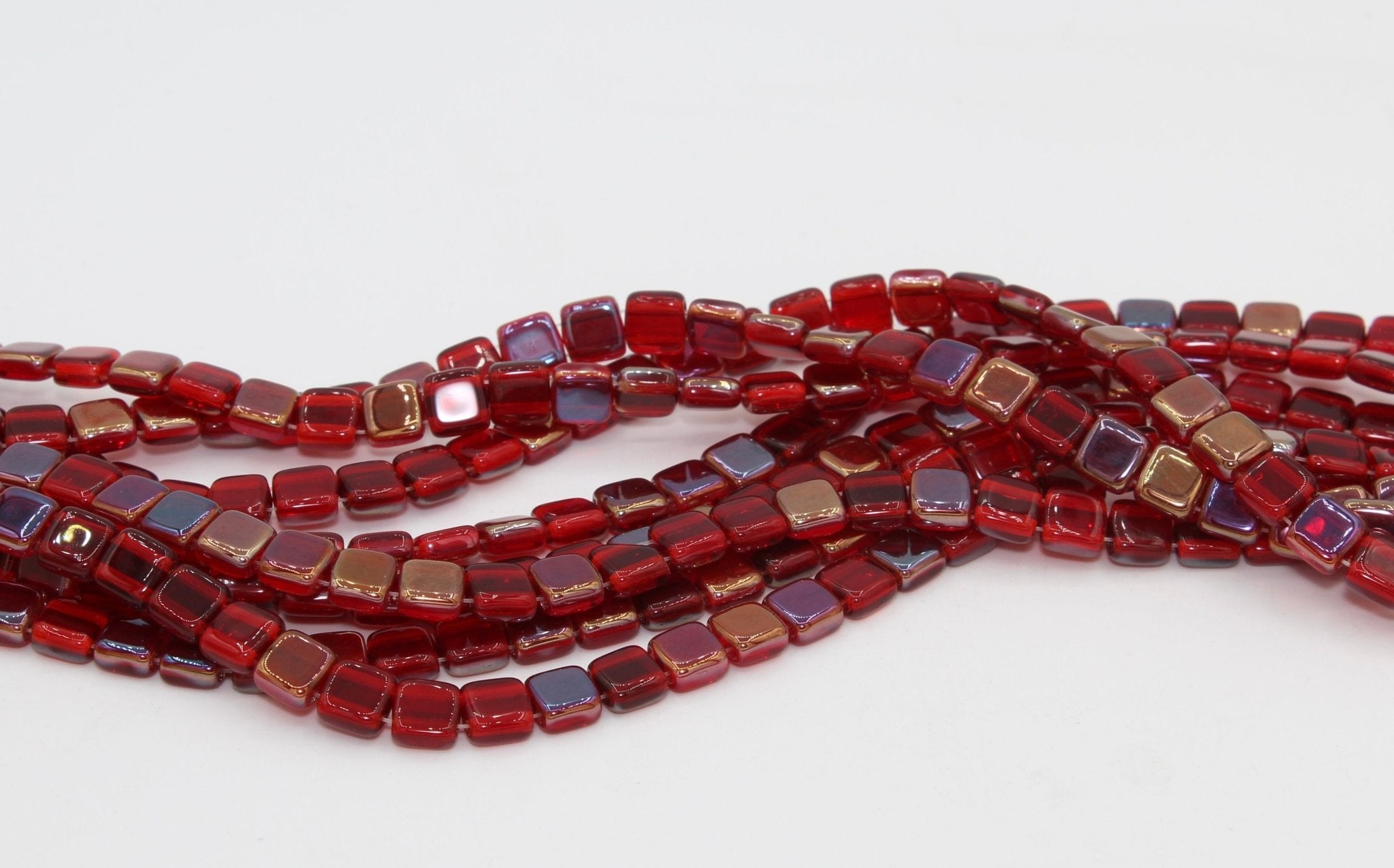 Transparent Red Rainbow Czech Mate Tile Beads - 6mm