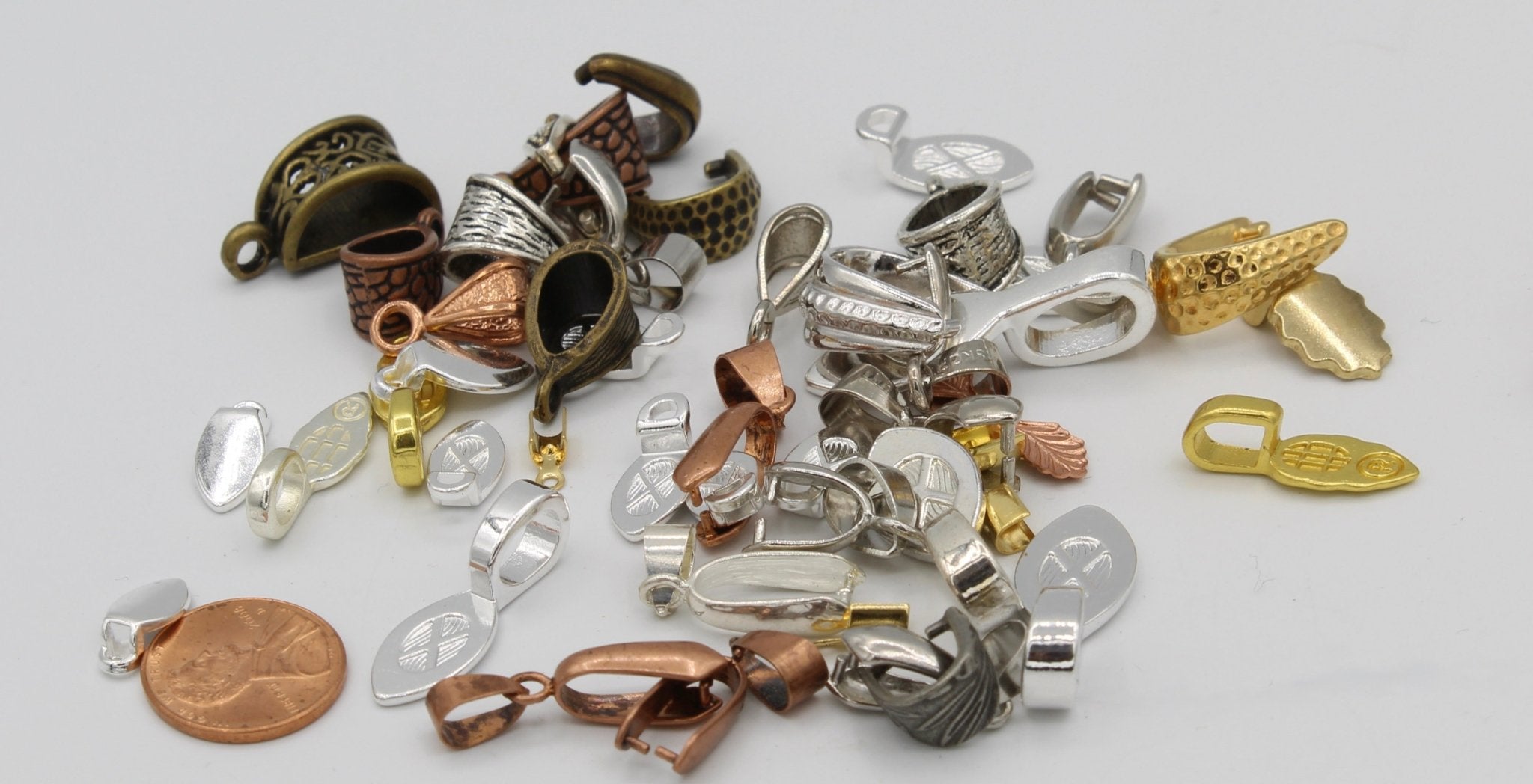 These bail assortments include pinch bails, glue on bails (for pendants or stones without holes), and bails that are strung. There are approximately 75 bails per bag.