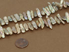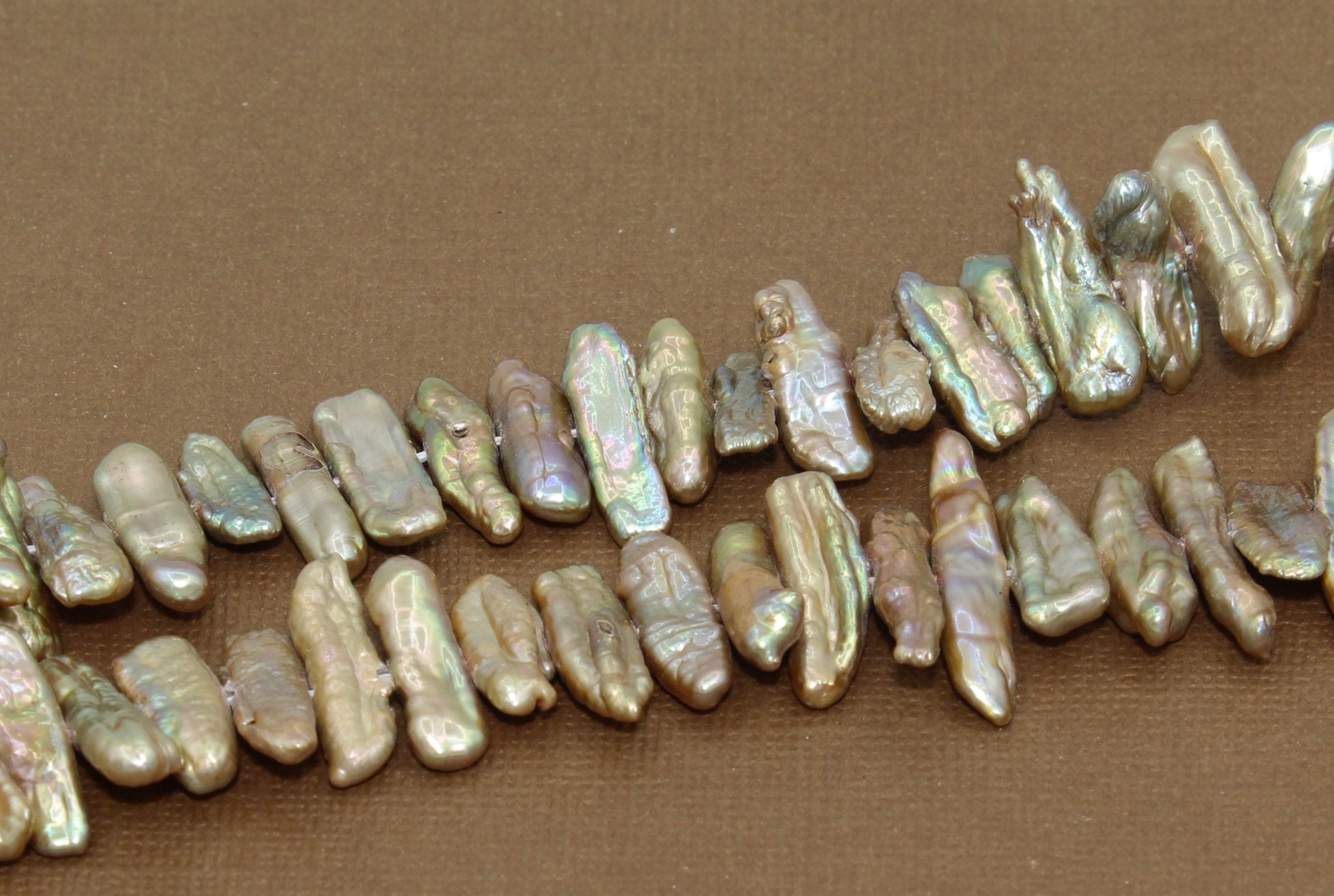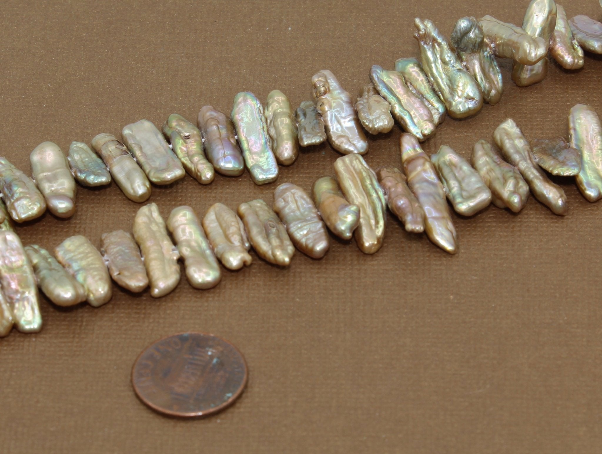 These beautiful stick shaped pearl beads are a champagne luster color (dyed). The pearls are approximately 20mm x 4mm (7/8" x 1/4"). They are drilled through the width of the bead.
