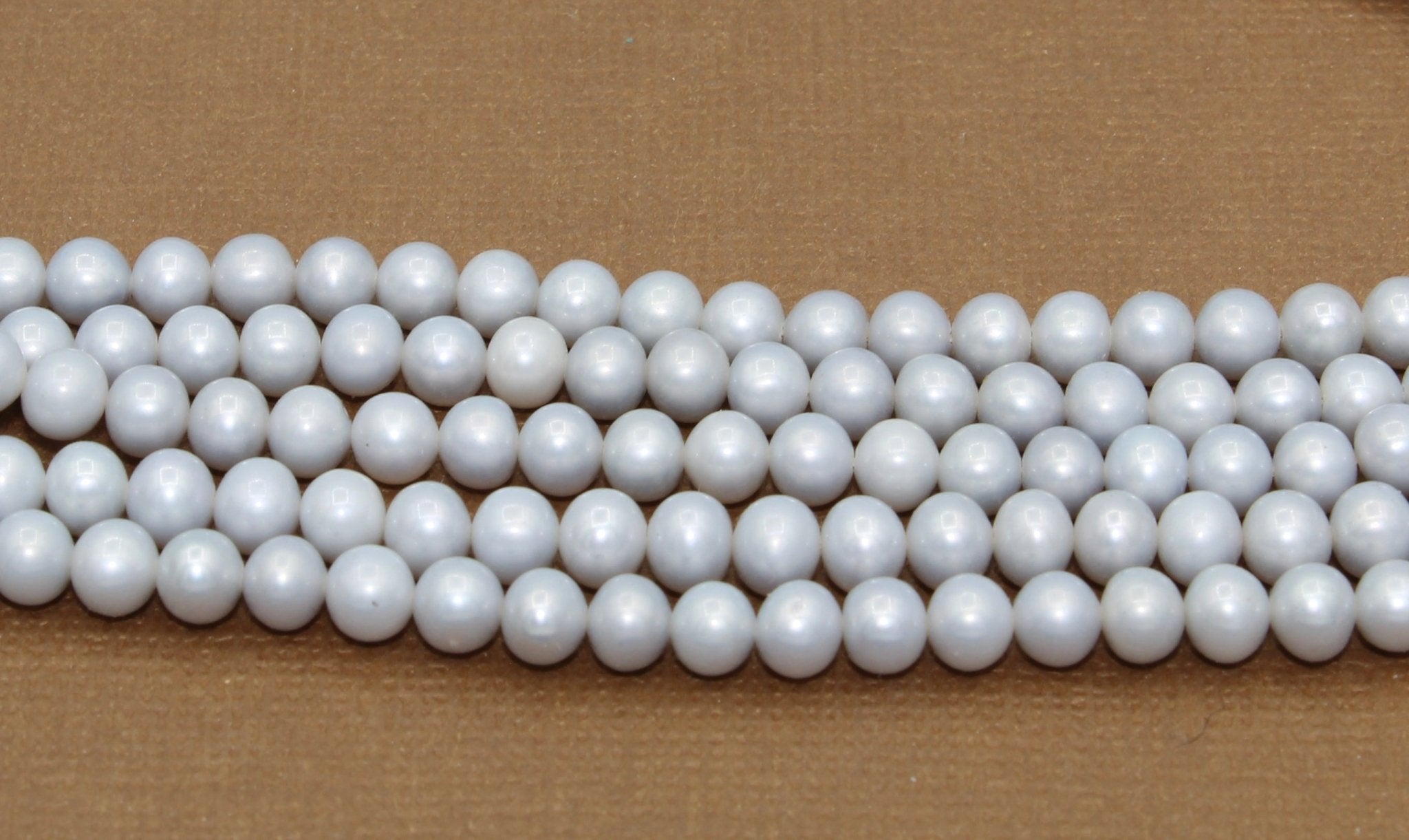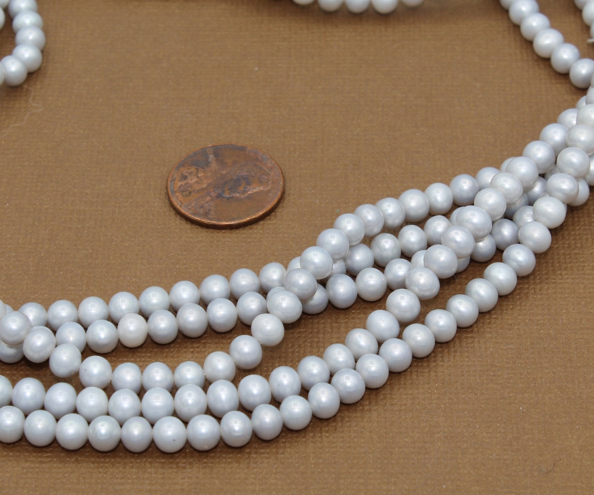 These round pearl beads are a light grey color. They are not perfectly round but slightly egg shaped.