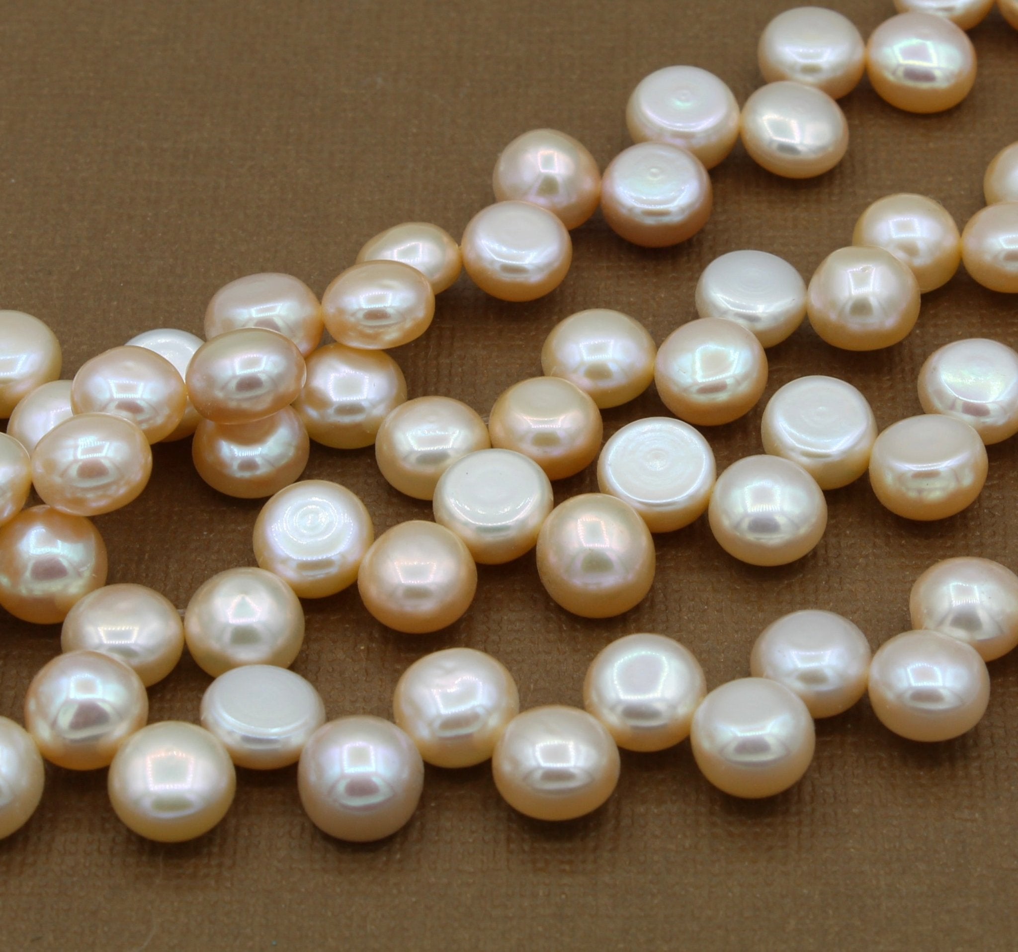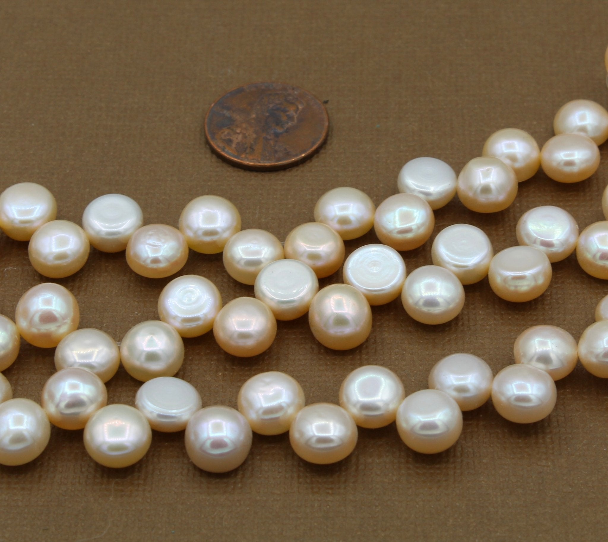 These coin shaped pearl beads are peach toned and drilled across the top. One side of each pearl is flat, making them ideal for earrings and bead embroidery.