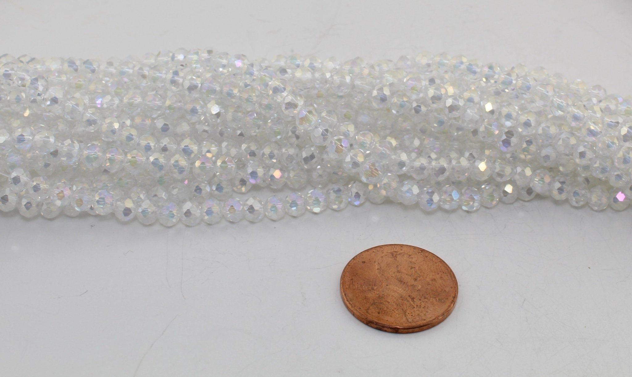 These faceted glass rondelles are 3 x 4mm. They are sold as a 14" strand with approximately 104 beads.