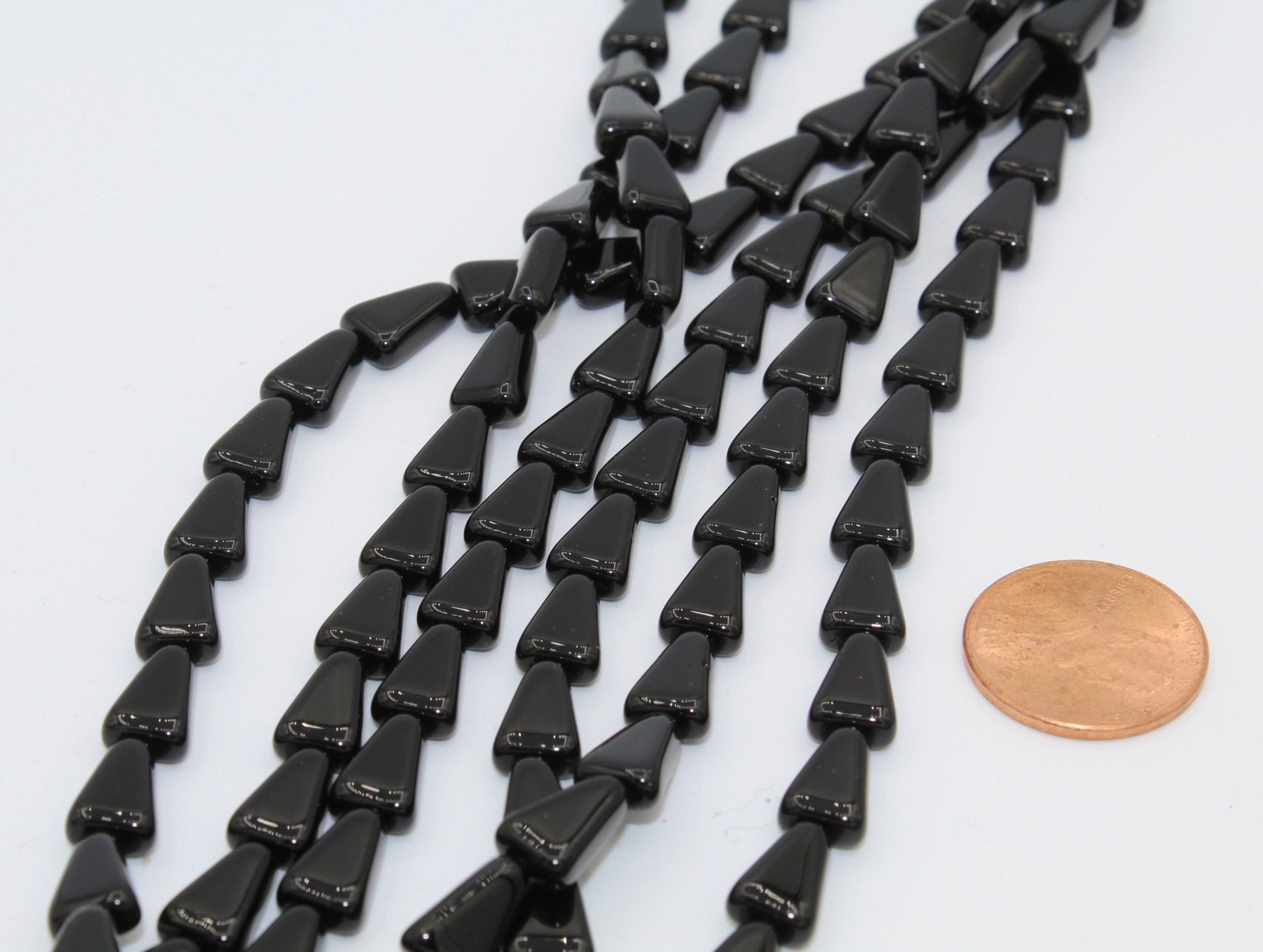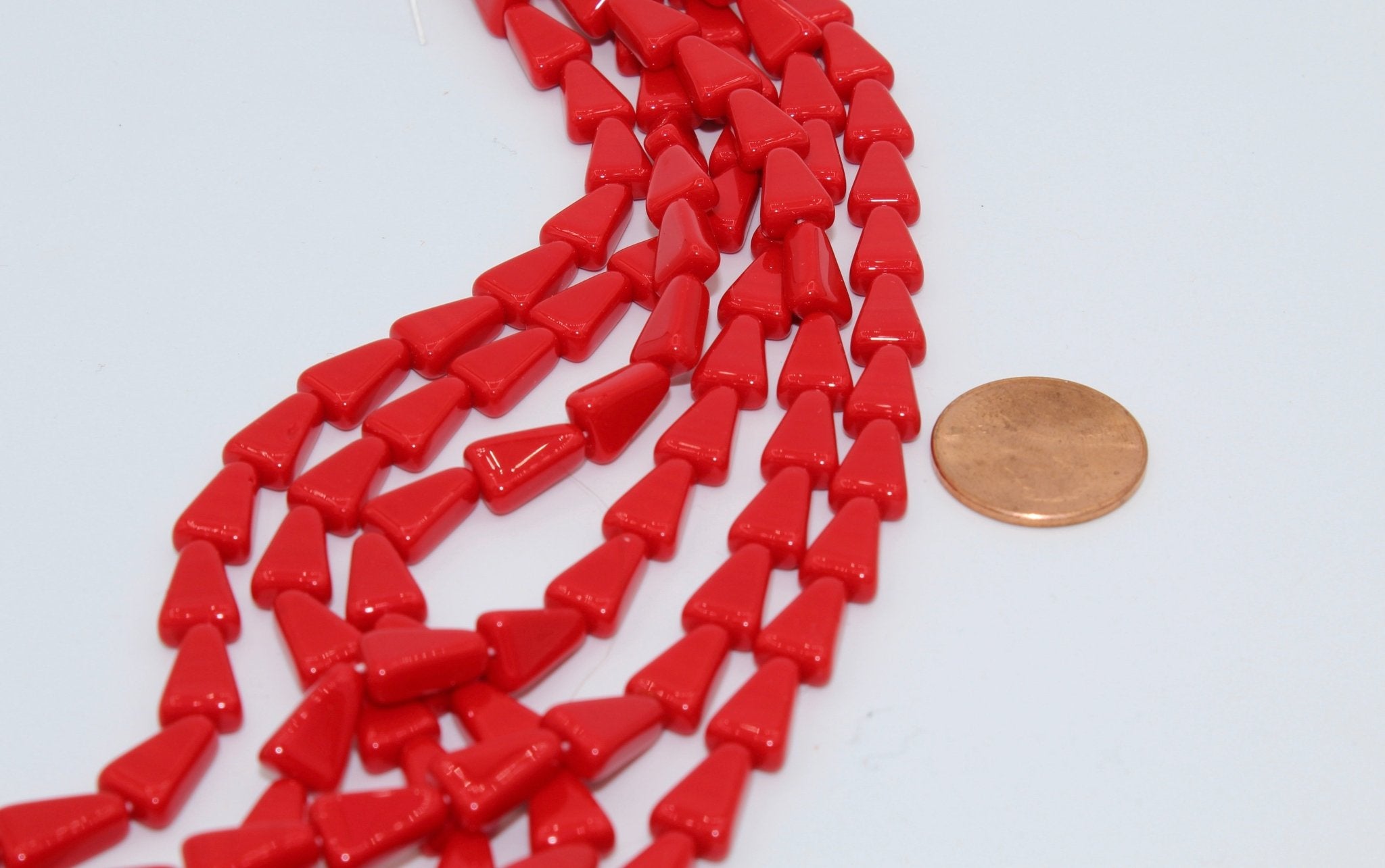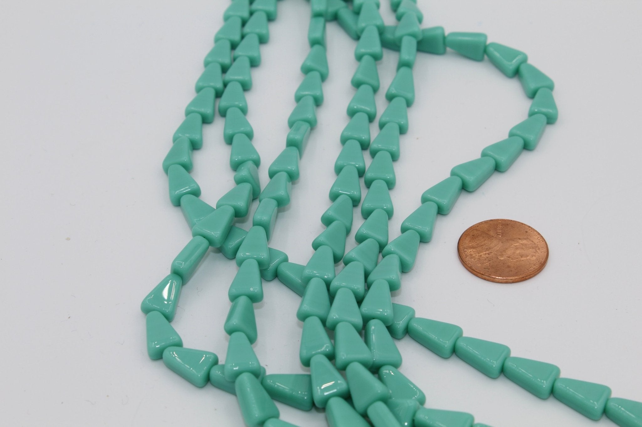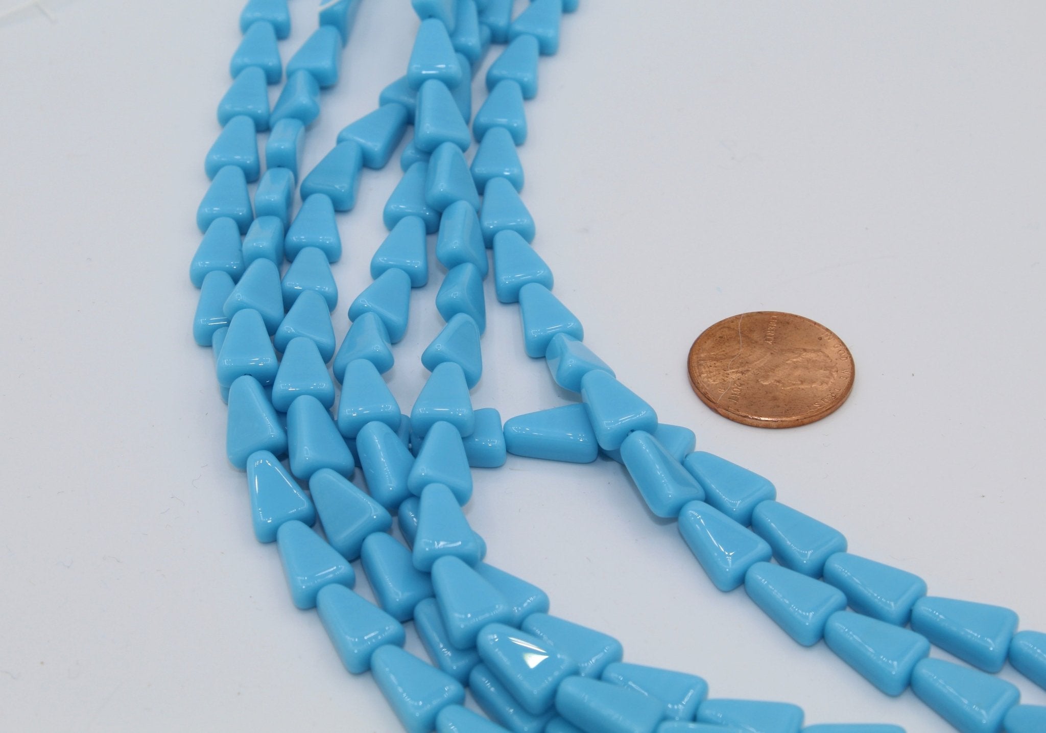 Our glass triangle beads are 10 x 7mm (.4" x .25") and have a hole running vertically. Triangle beads are often strung to create beaded earrings, necklaces and bracelets. They are also used in bead embroidery and mosaics. They come in a variety of colors most commonly used in Native American and western jewelry.