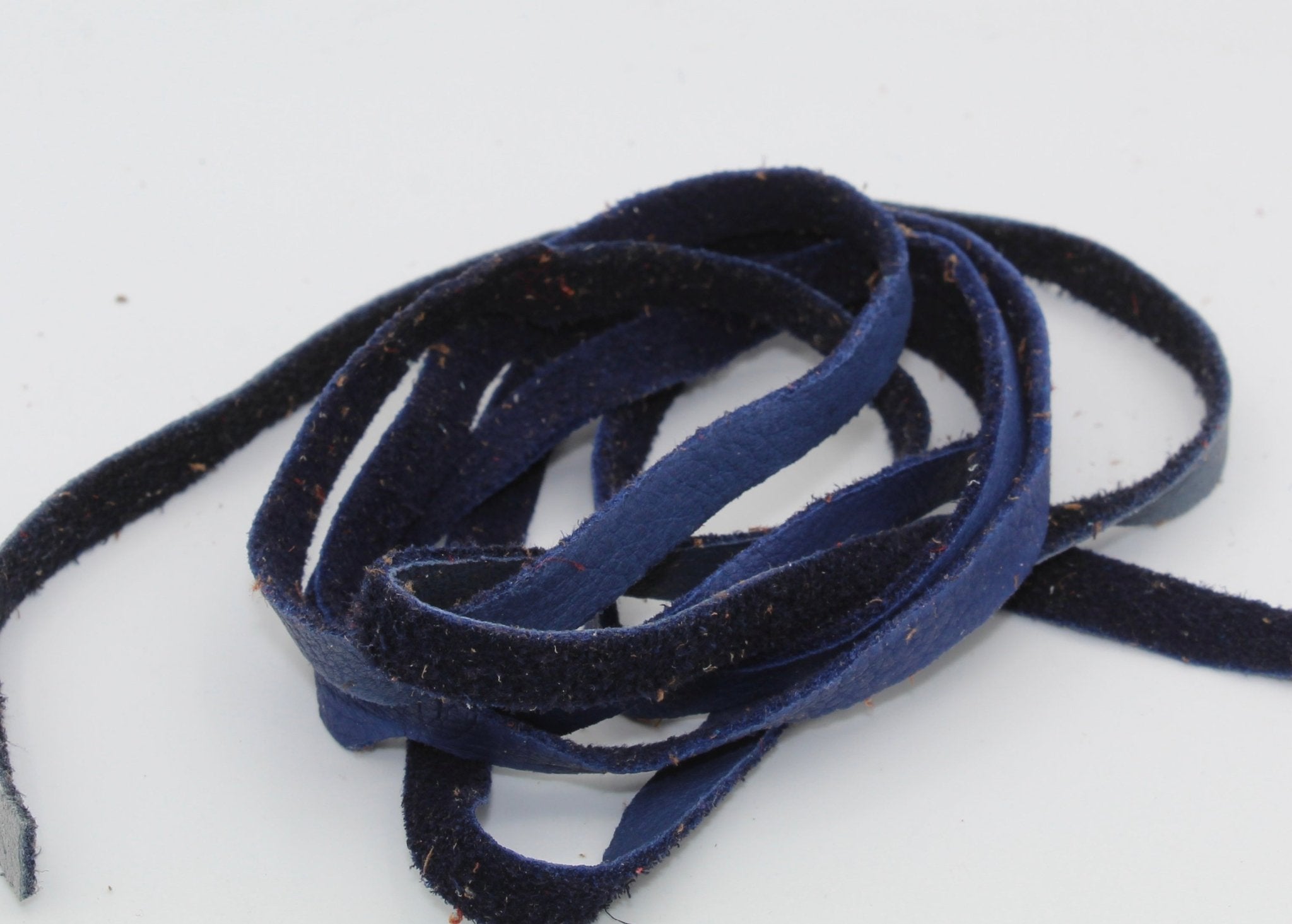 This buckskin strip is hand cut, dyed and it is approximately 42" long x 1/4" (5mm) wide x 2mm thick. Each strip has a smooth side and a rough side.