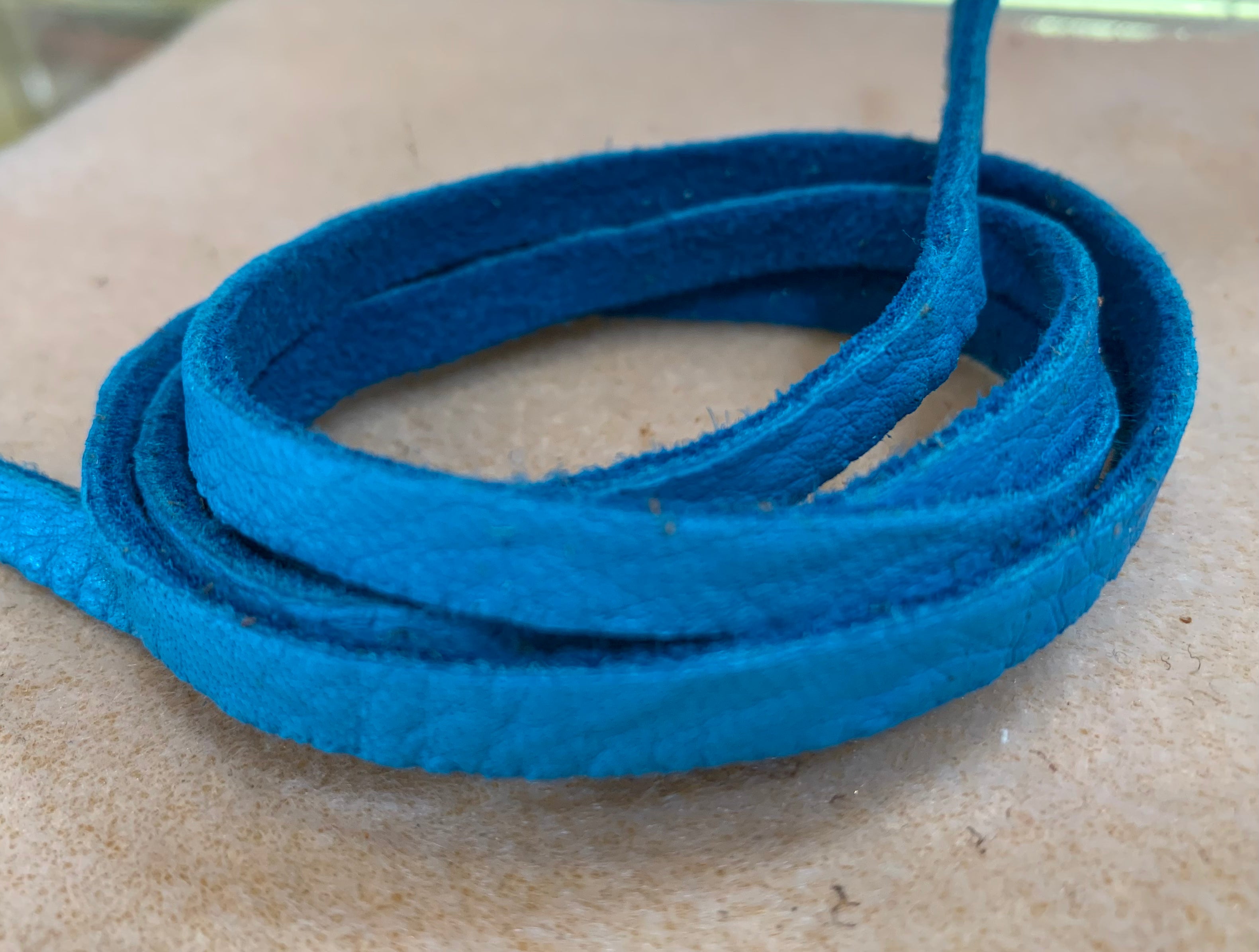 This buckskin strip is hand cut and it is approximately 36” long x 1/4" (5mm) wide x 2mm thick. Each strip has a smooth side and a rough side.
