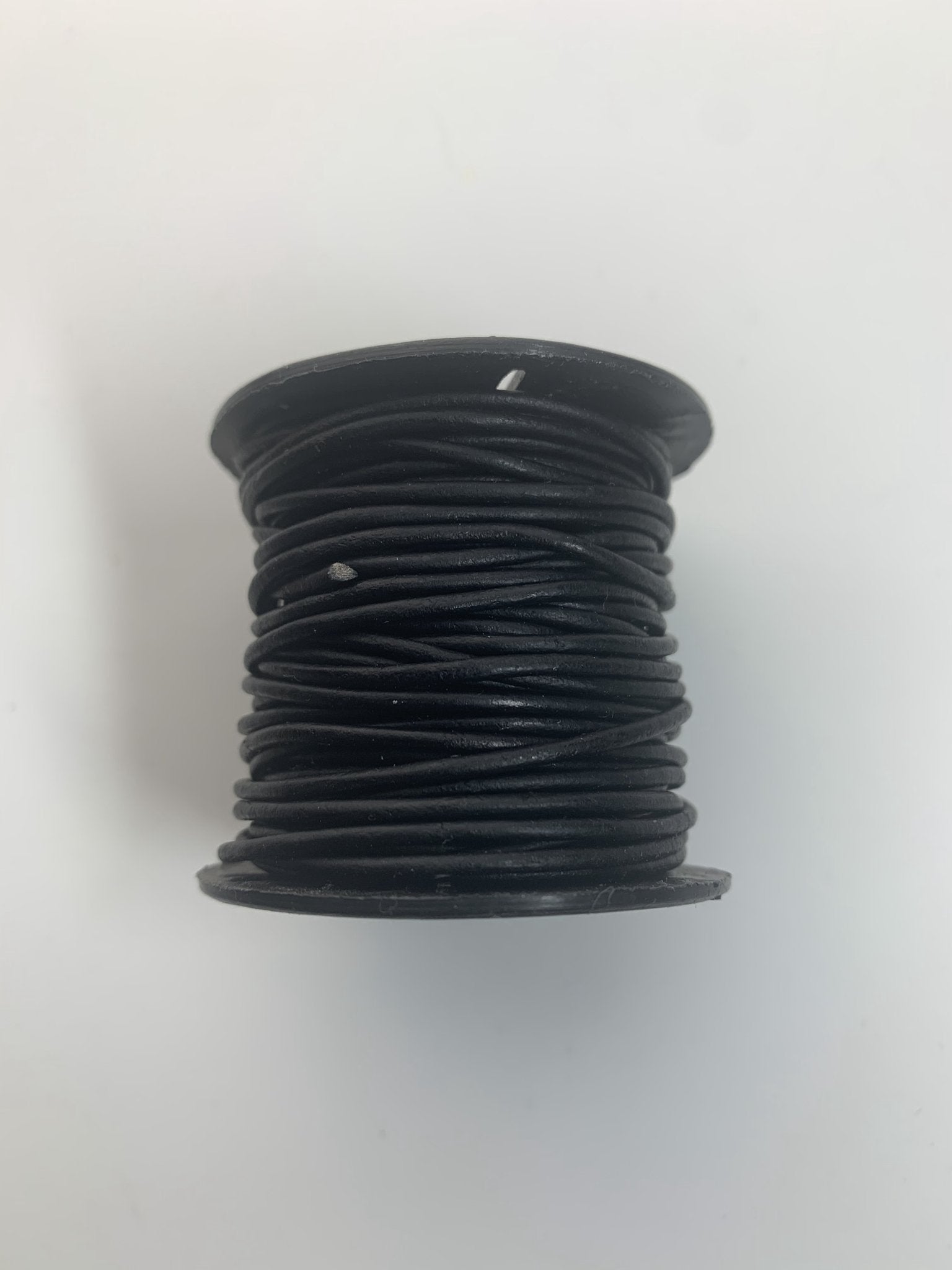 This leather is 1.5mm or 2mm in diameter and sold by the spool. Each spool is approximately 33 feet (10 meters) long.