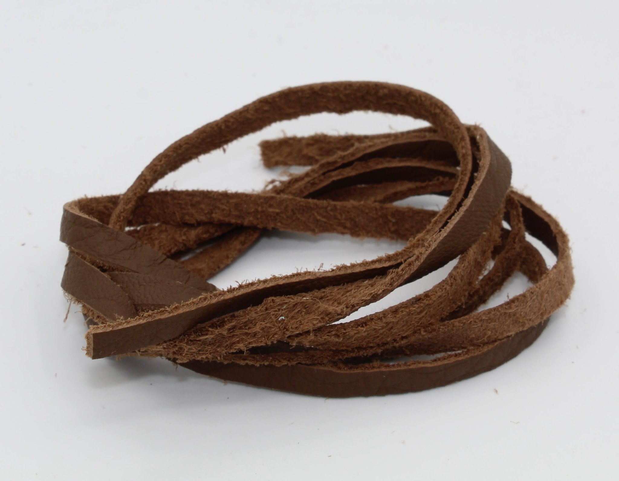 This buckskin strip is hand cut, dyed and it is approximately 40" long by 3/16" (4mm) wide. It is 1 mm thick.