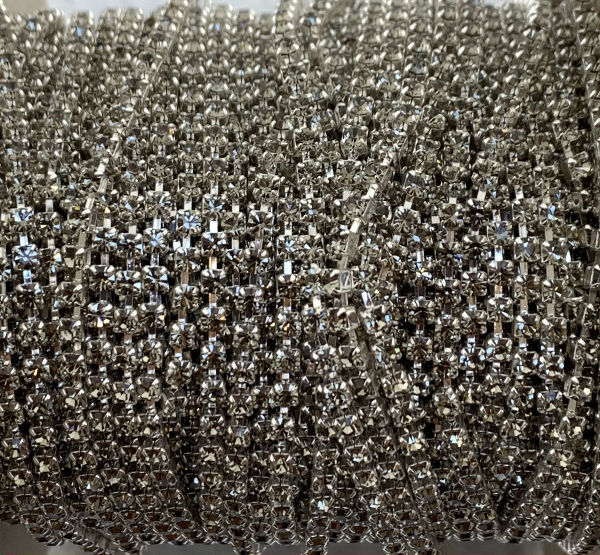 This metal banding has black diamond (black diamond appears like a transparent silver) colored crystals set in silver plated metal banding.