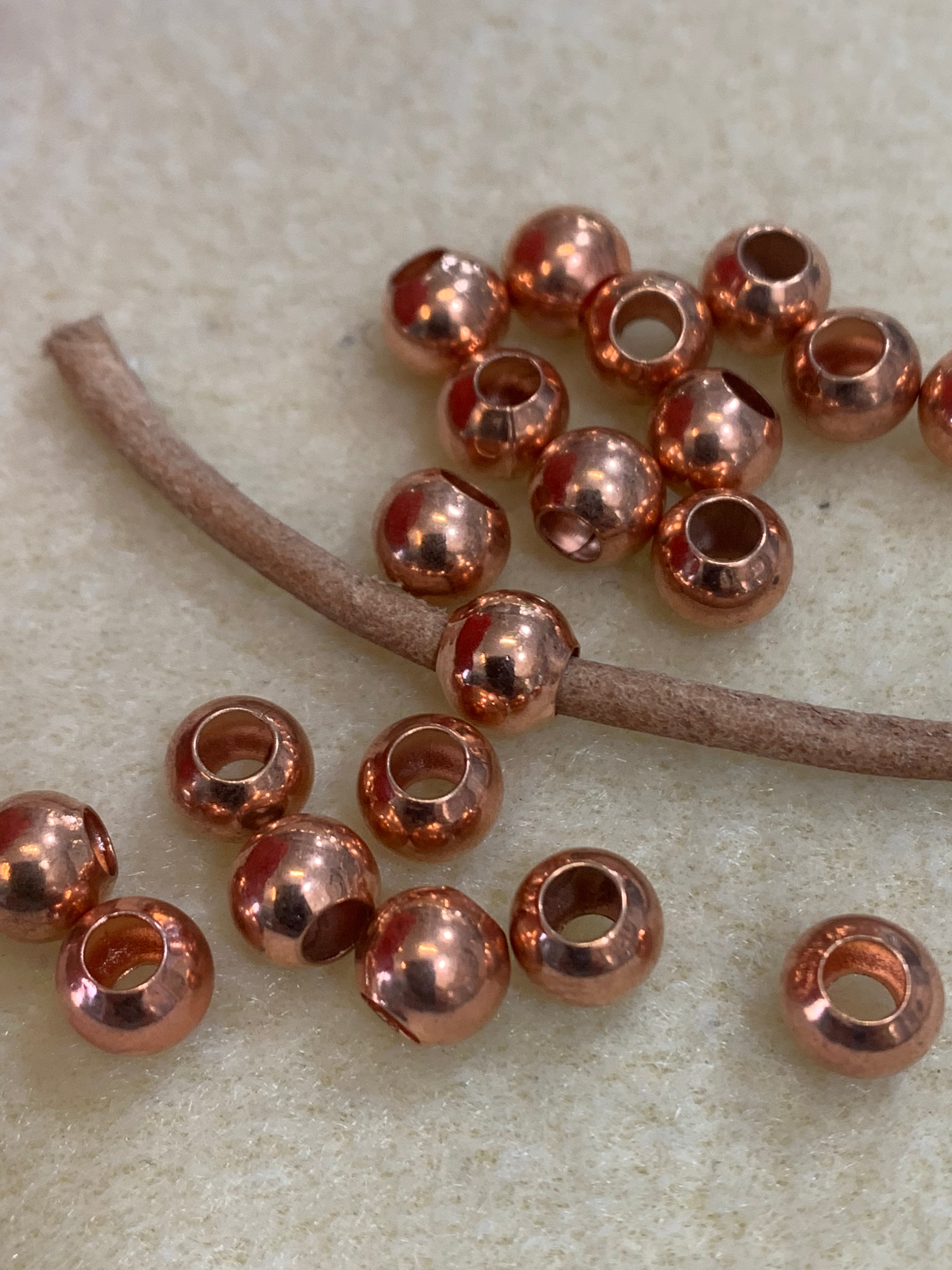 These copper beads are 8mm (1/4") with a 4mm (1/8") opening. These large hole metal beads are perfect for stringing leather through and for using as a tension bead at the back of a beaded hatband.
