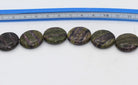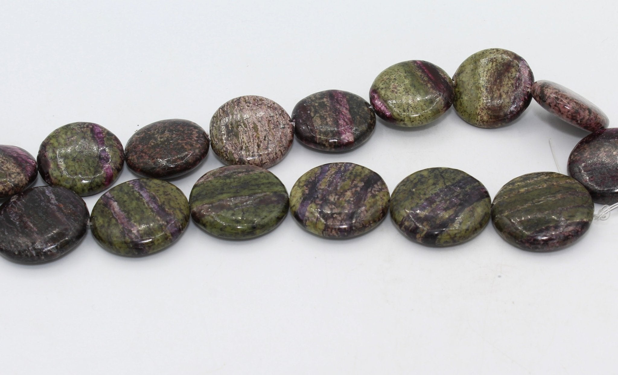 These Micanite coin shaped beads are a beautiful mix of green, purple and silver tones. They are 14mm (5/8') in diameter with a 1mm hole drilled across the stones.