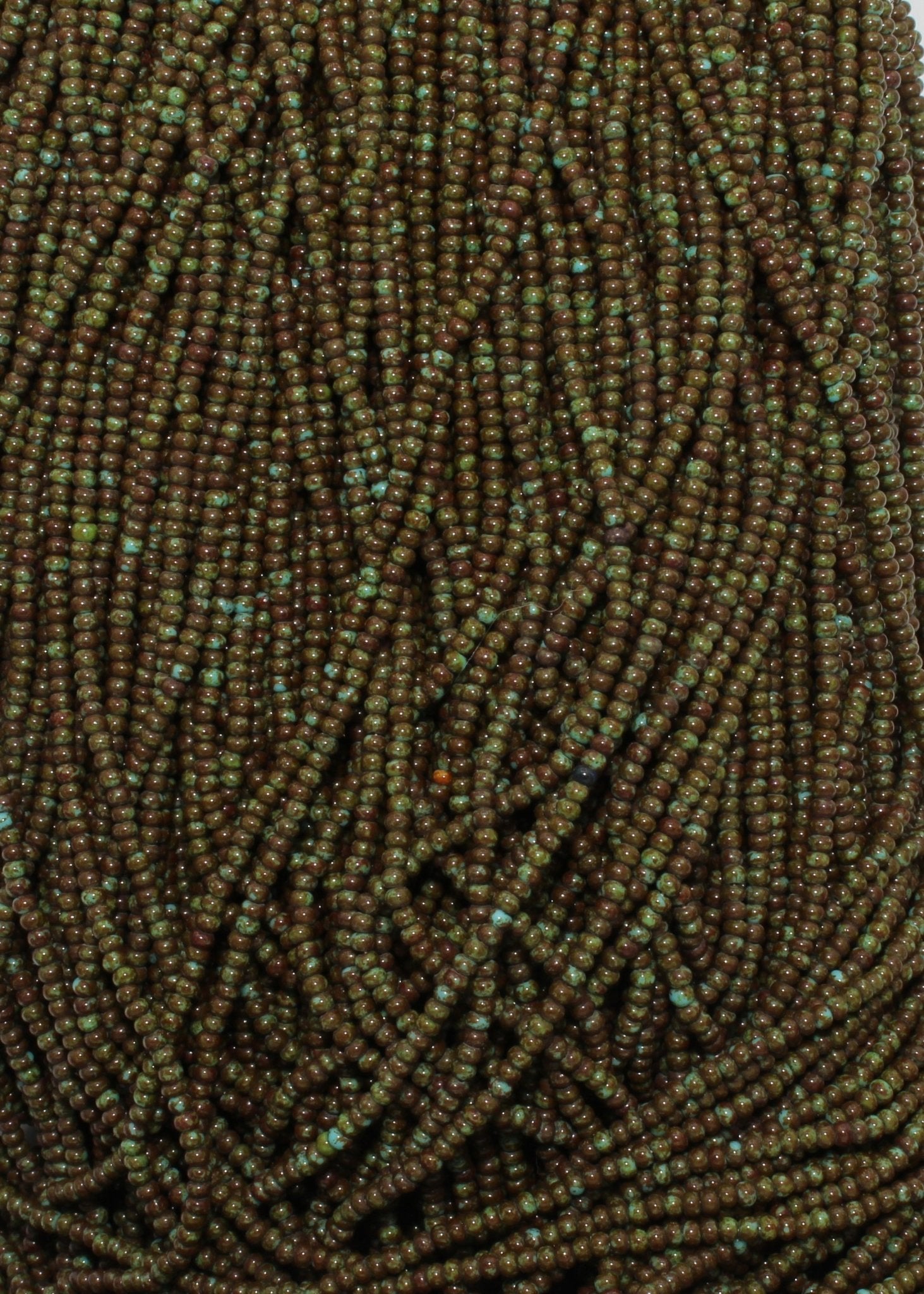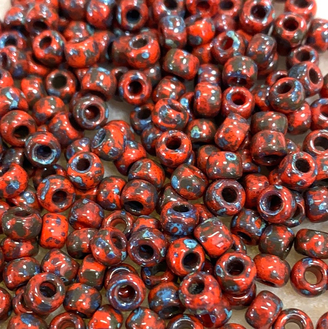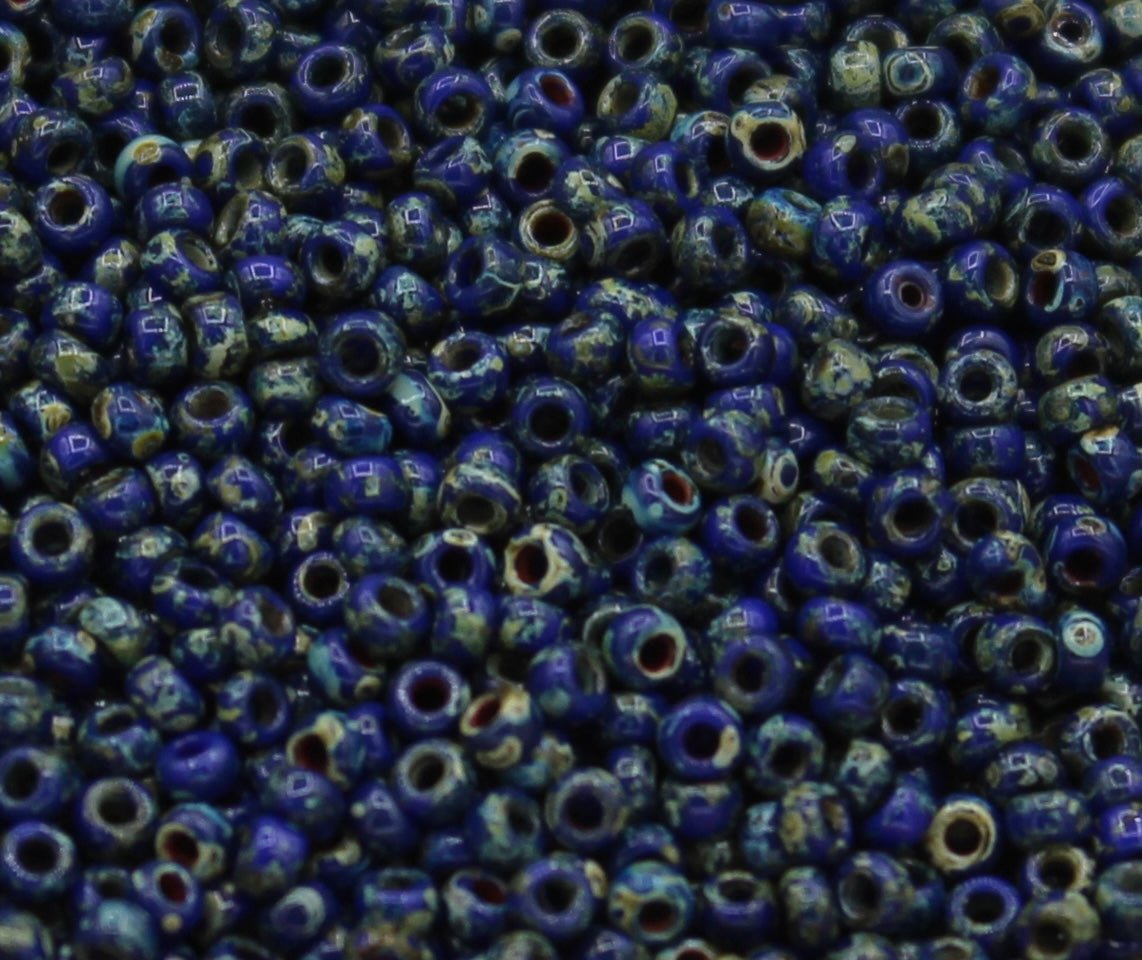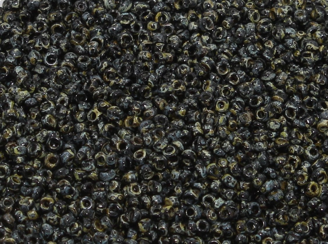 Picasso and Travertine beads have a coating that appears mottled and speckled, and features a range of colors. These beads have a natural, earthy appearance like a mottled stone.
