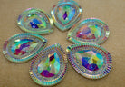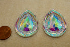 They are Crystal AB, and have flat backs. They are 30mm x 40mm (1.2” x 1.6”).