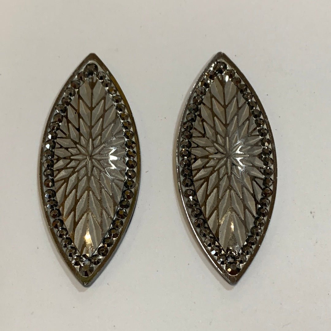 These flat back resin centerpieces are 19mm x 49mm. They are sew down crystal centers with 2 holes.