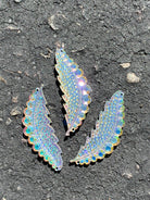 These White AB resin centerpieces have 2 holes for sewing to bead foundation. They are 51mm x 19mm (2” x 3/4”). They are sold by the pair.