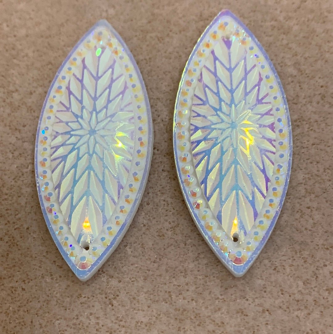 These flat back resin centerpieces are 19mm x 49mm. They are sew down crystal centers with 2 holes.