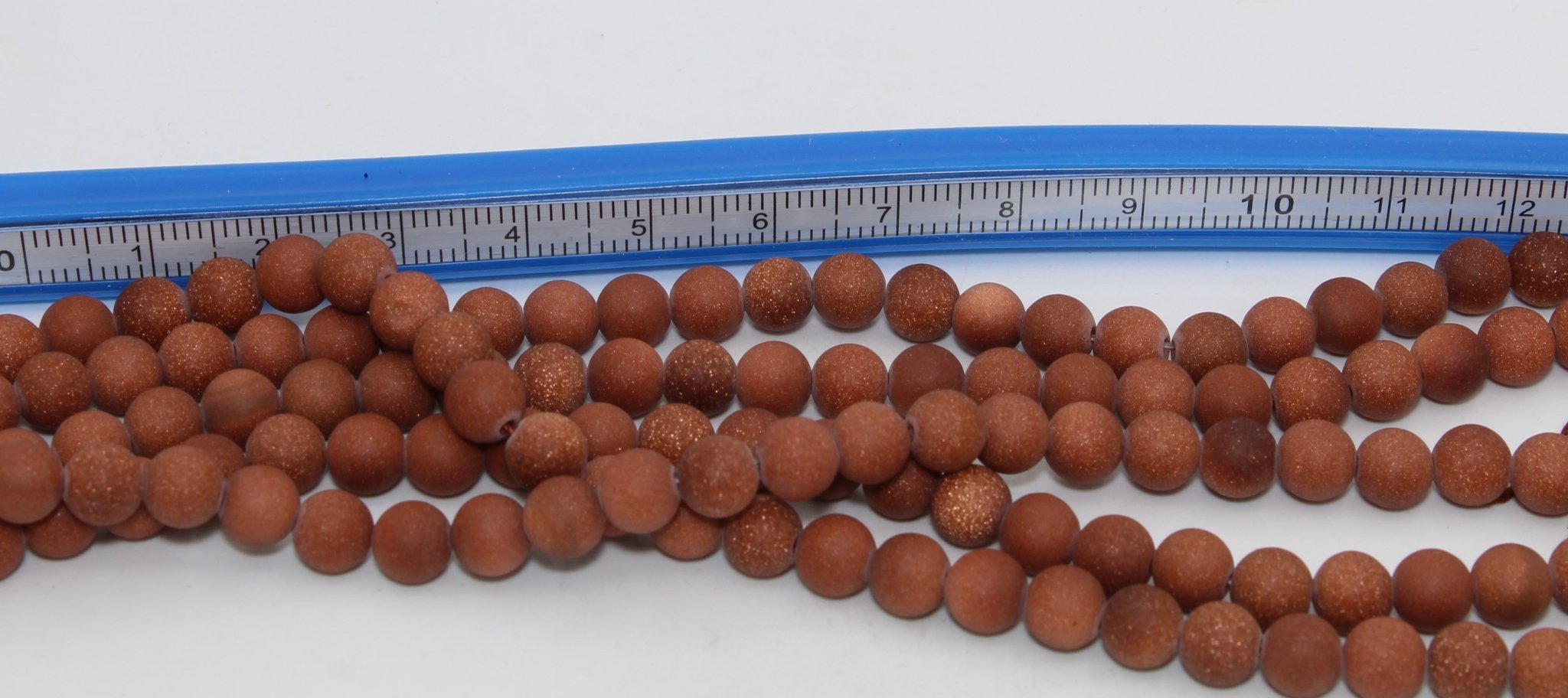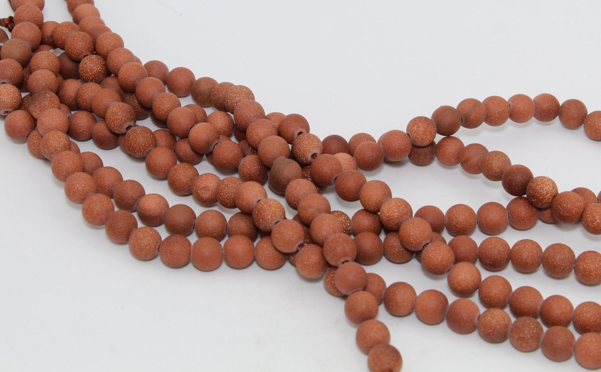 These goldstone beads are round with a matte finish. They almost have the appearance of agate or pipestone. Goldstone is a man made composite stone.