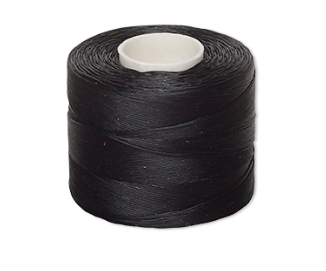 This black Nymo thread is size B. It comes in a spool of 350 yards (1050 feet). It is suitable for most bead weaving projects and is thinner than size D and thicker than size O.