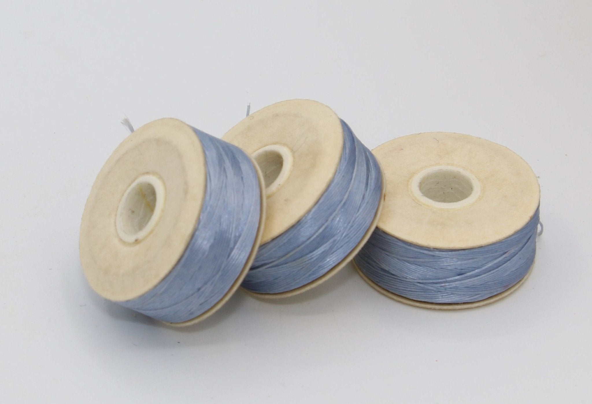 This Nymo thread is sold as an individual bobbin. It is light blue and works well with pastels, blue tones and other opaque colors. Nymo has a bit of stretch to it, making it a good choice for fringe.
