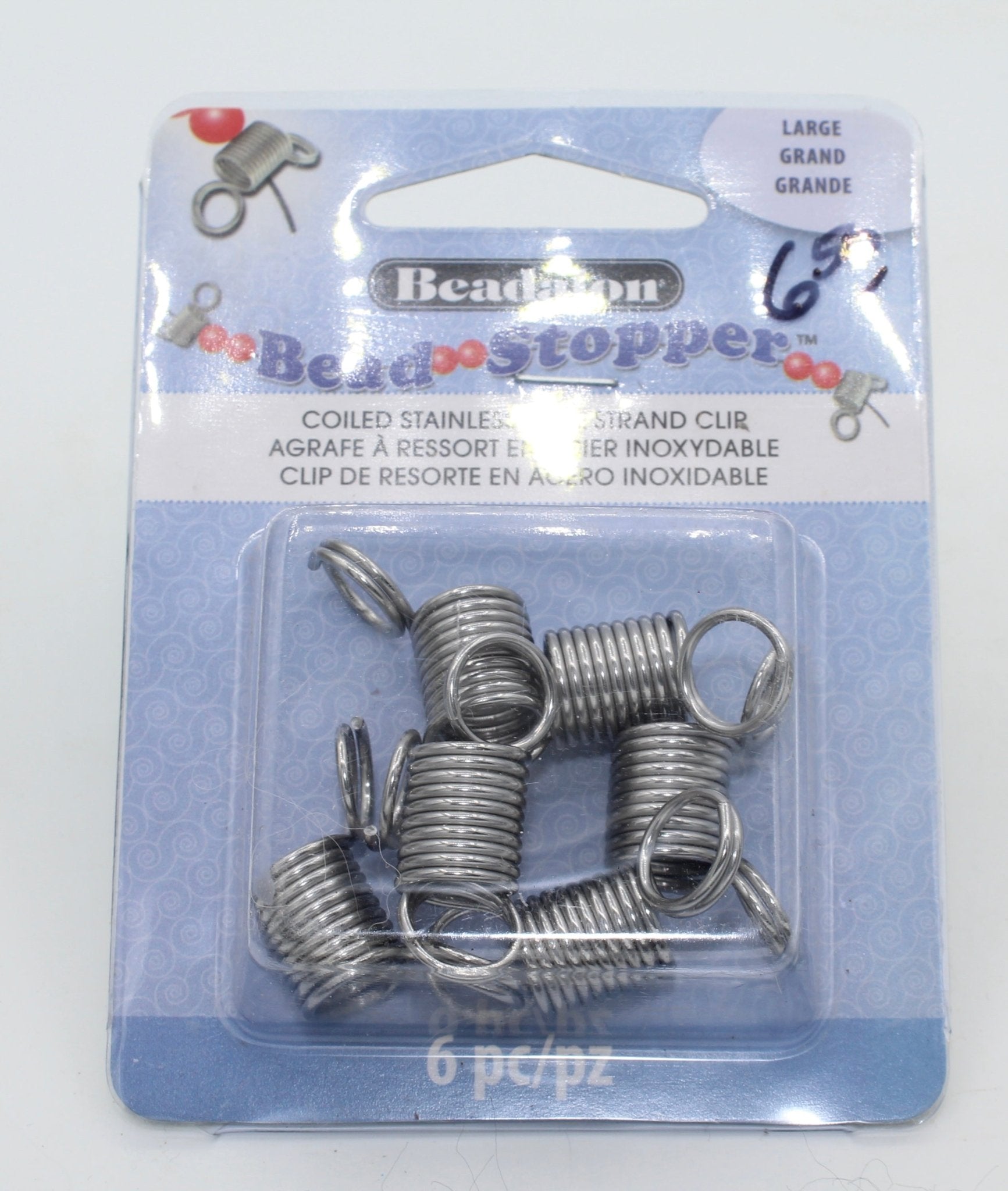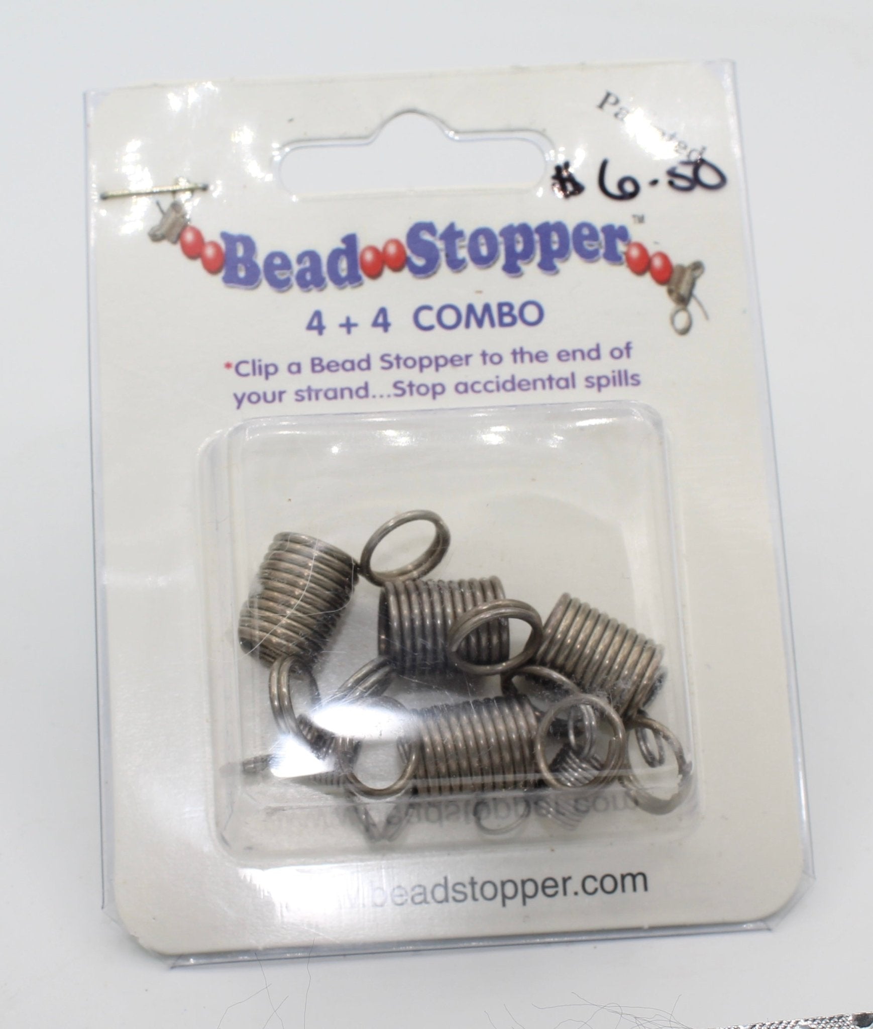 Bead stoppers are used to clip onto the end of your bead cord to stop accidental spills. Bead stoppers are used by squeezing the two ends together and placing the coils over your stringing material.
