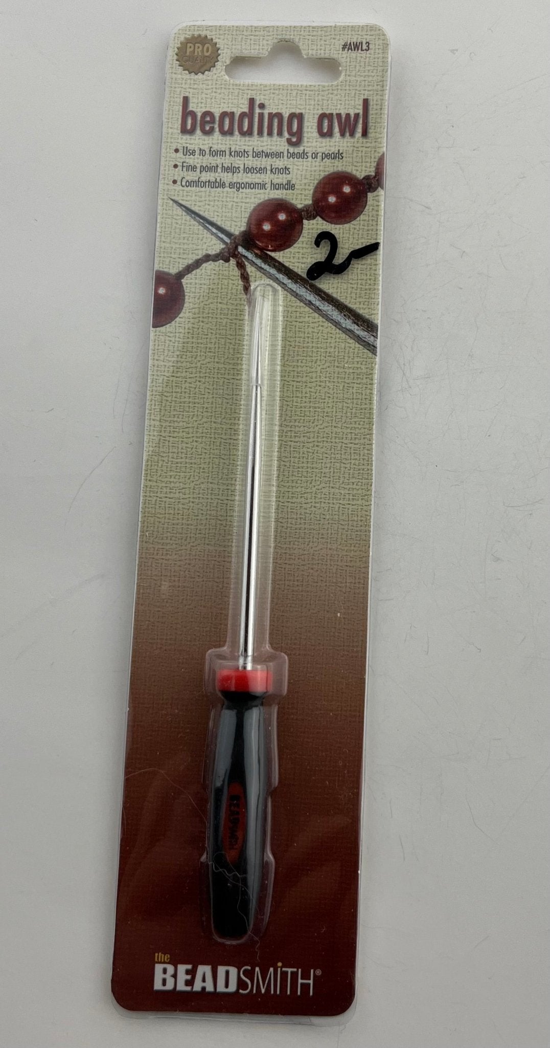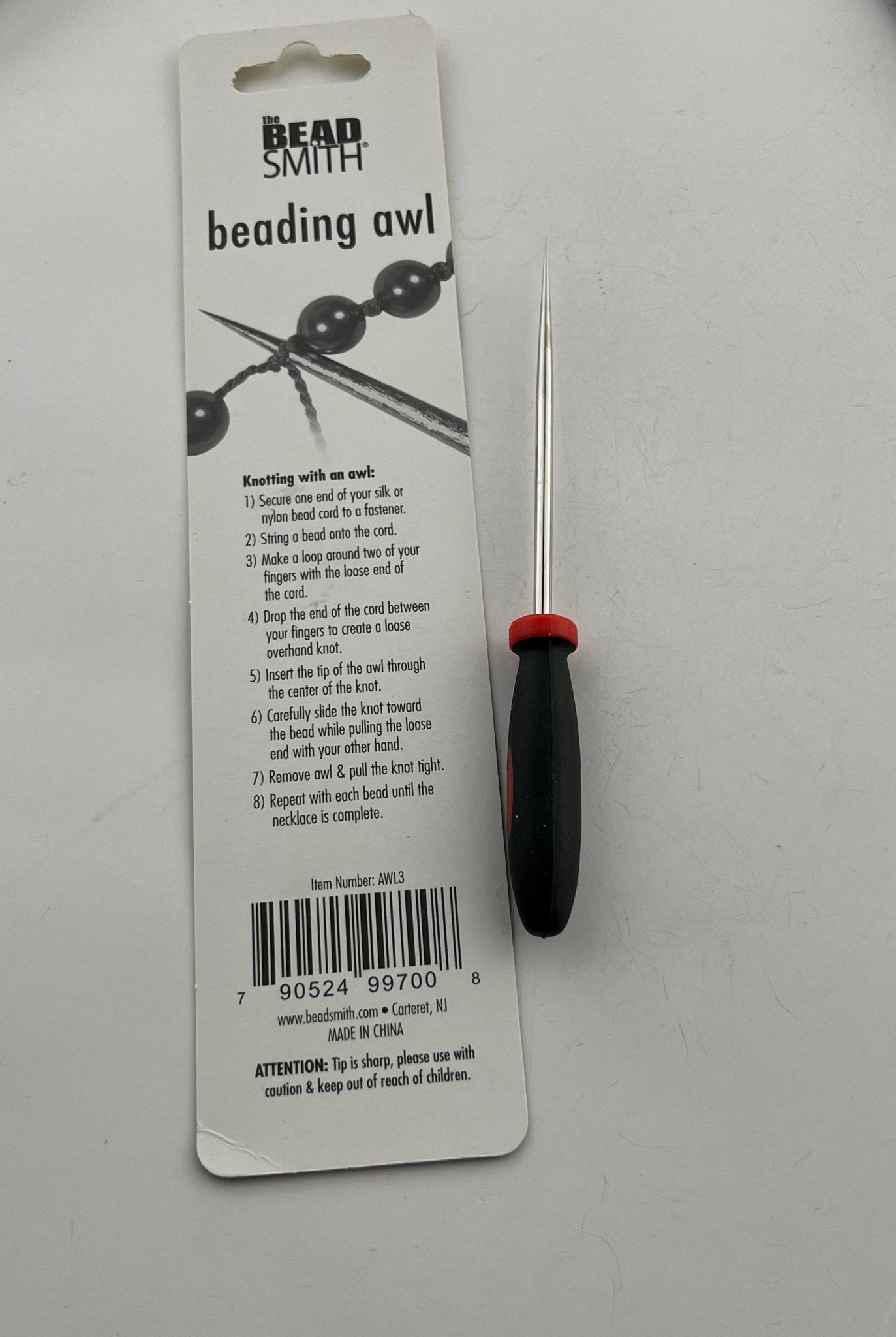 Beading awls are useful for tying knots, undoing knots and in basketry work. This awl is 5" long (13cm) with a sharp tip.