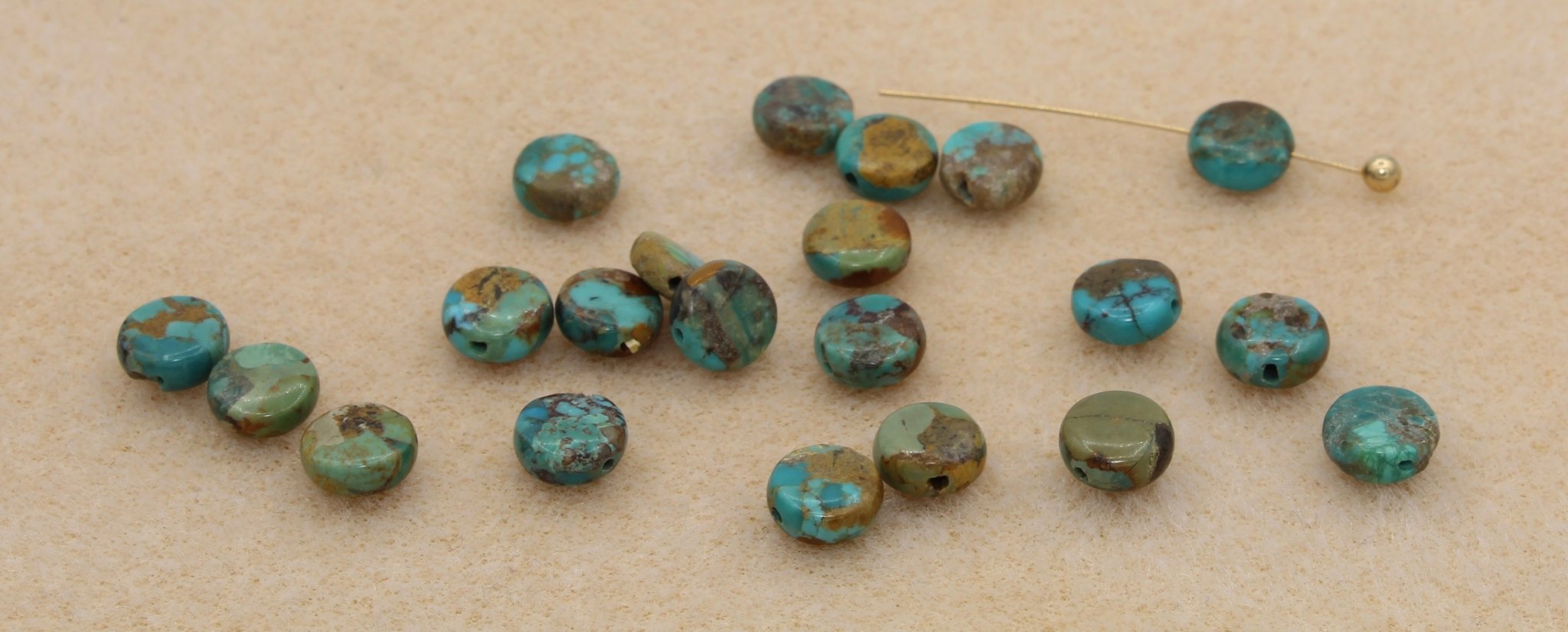 Turquoise is relatively soft, on the 5-6 range of the Mohrs scale. It is is cut into cabachons, focal pendants and beads.