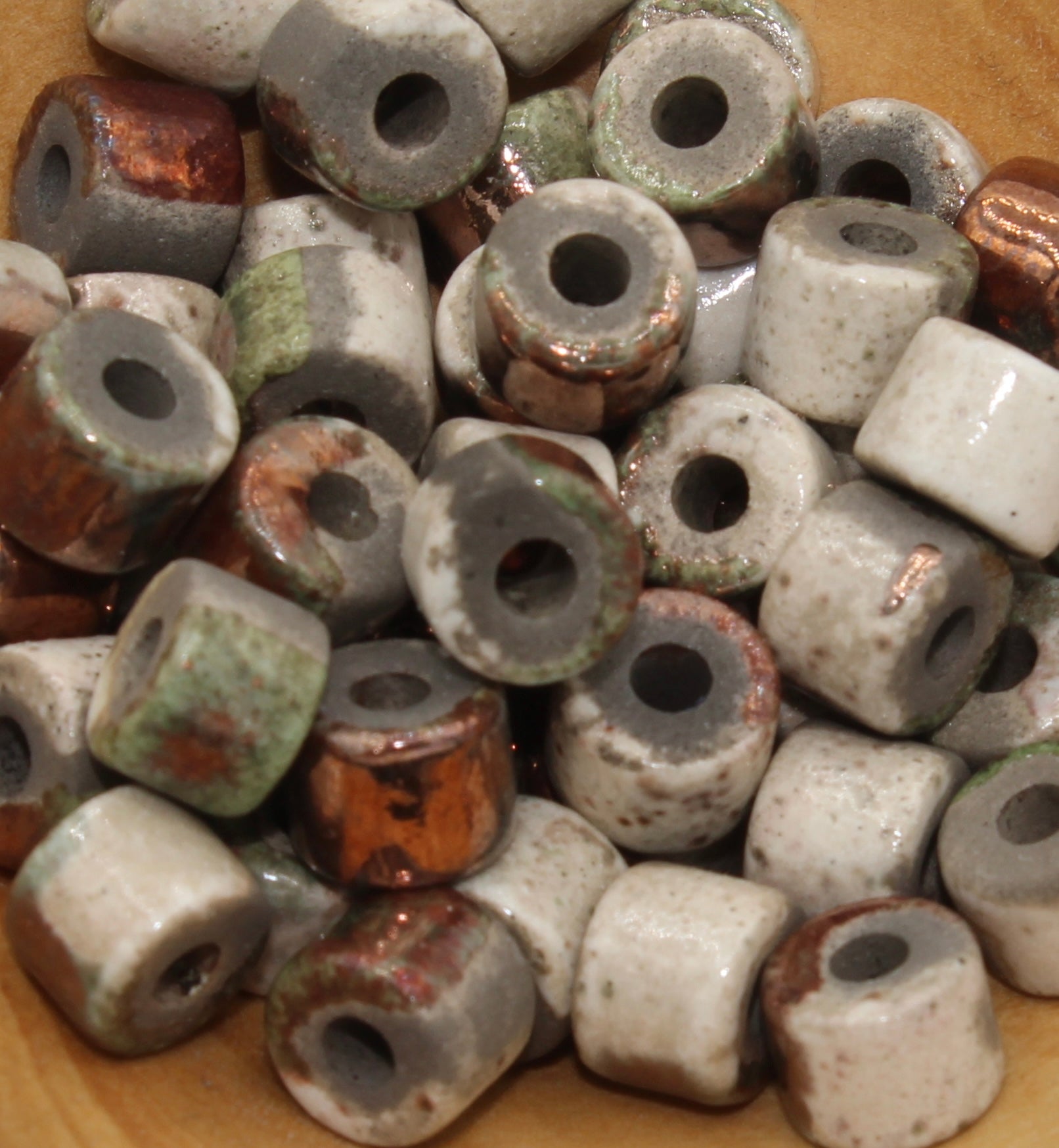 These ceramic beads are glazed white, dark copper and hematite colors and are tube shaped. They are approximately 7mm (3/8") x 5mm (1/4"). The hole is approximately 2.5mm in diameter.