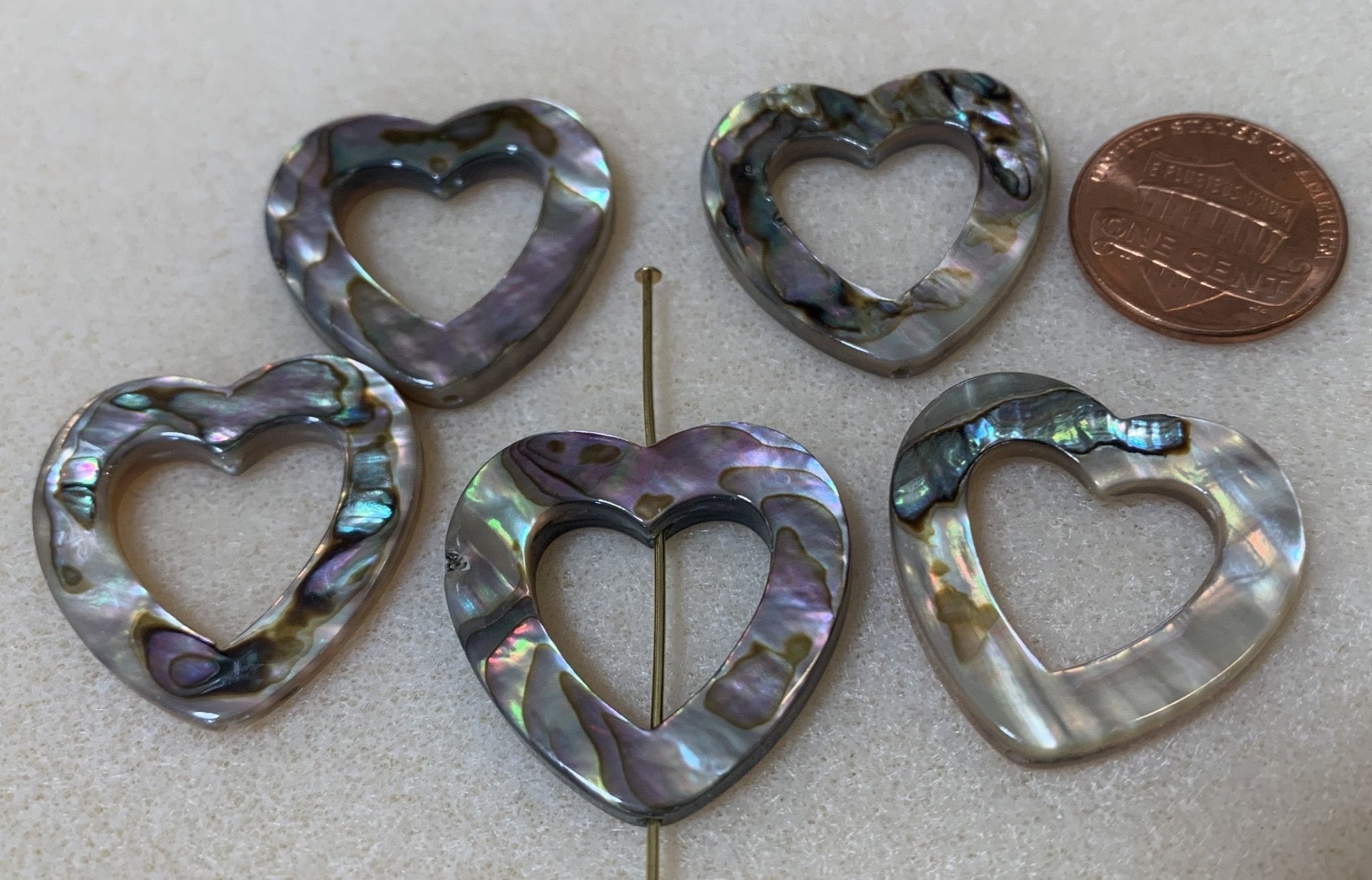 These abalone heart beads are approximately 1" x 3/4". They are drilled horizontally (see headpin in picture) and make great earrings. They are sold individually.