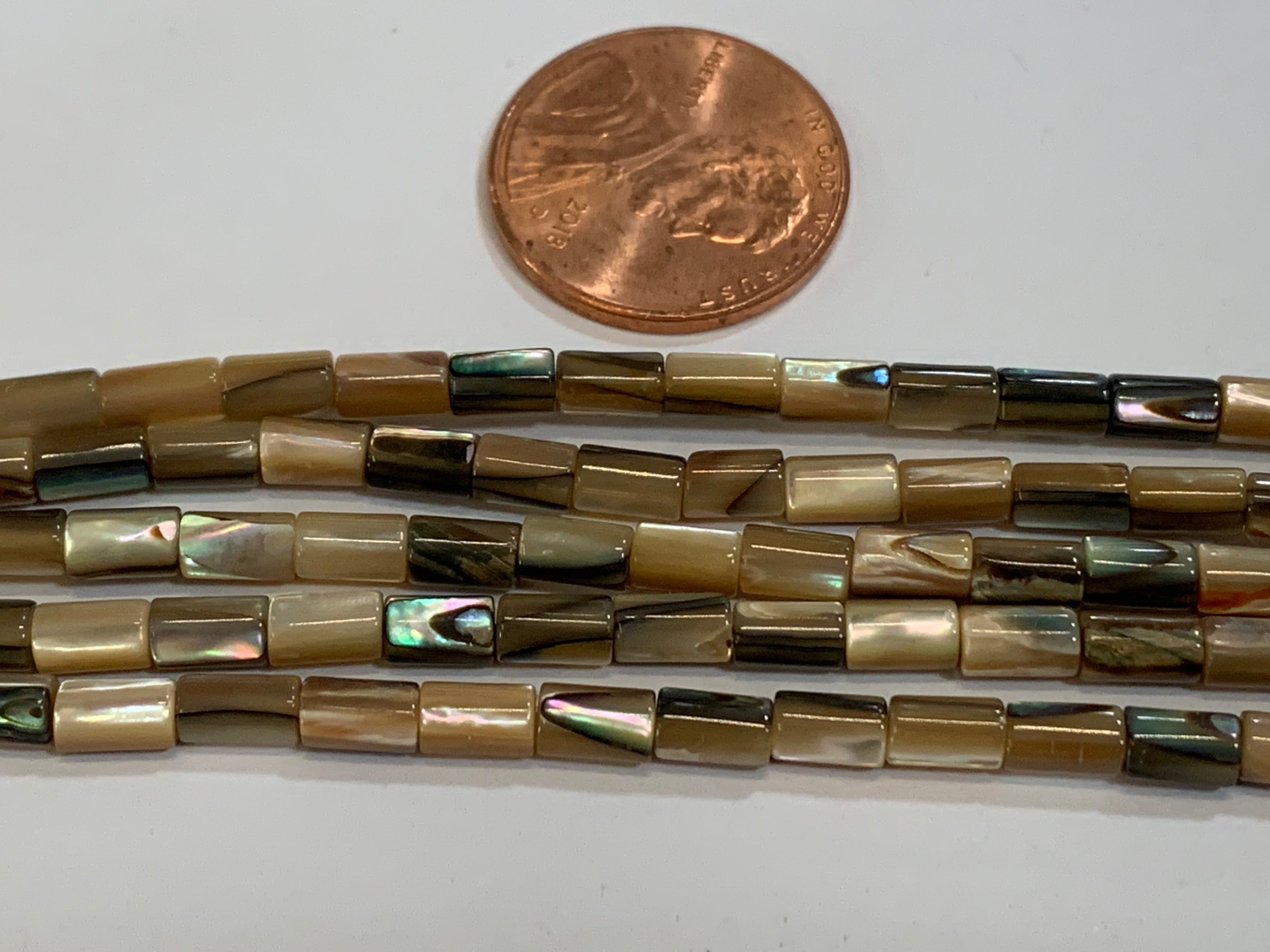 These abalone beads are approximately 5 x 3mm. They are sold on an 8” strand with approximately 38 beads per strand.