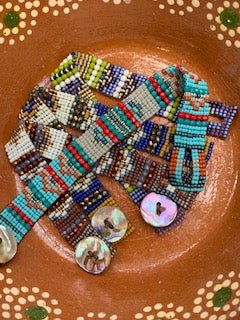 This is the pattern for the Abalone Weave Bracelet. Please note that colors for the different bracelets are listed at the end of the pattern. This project requires the use of a bead loom. Skills used are bead loom weaving and decreasing on a bead loom.