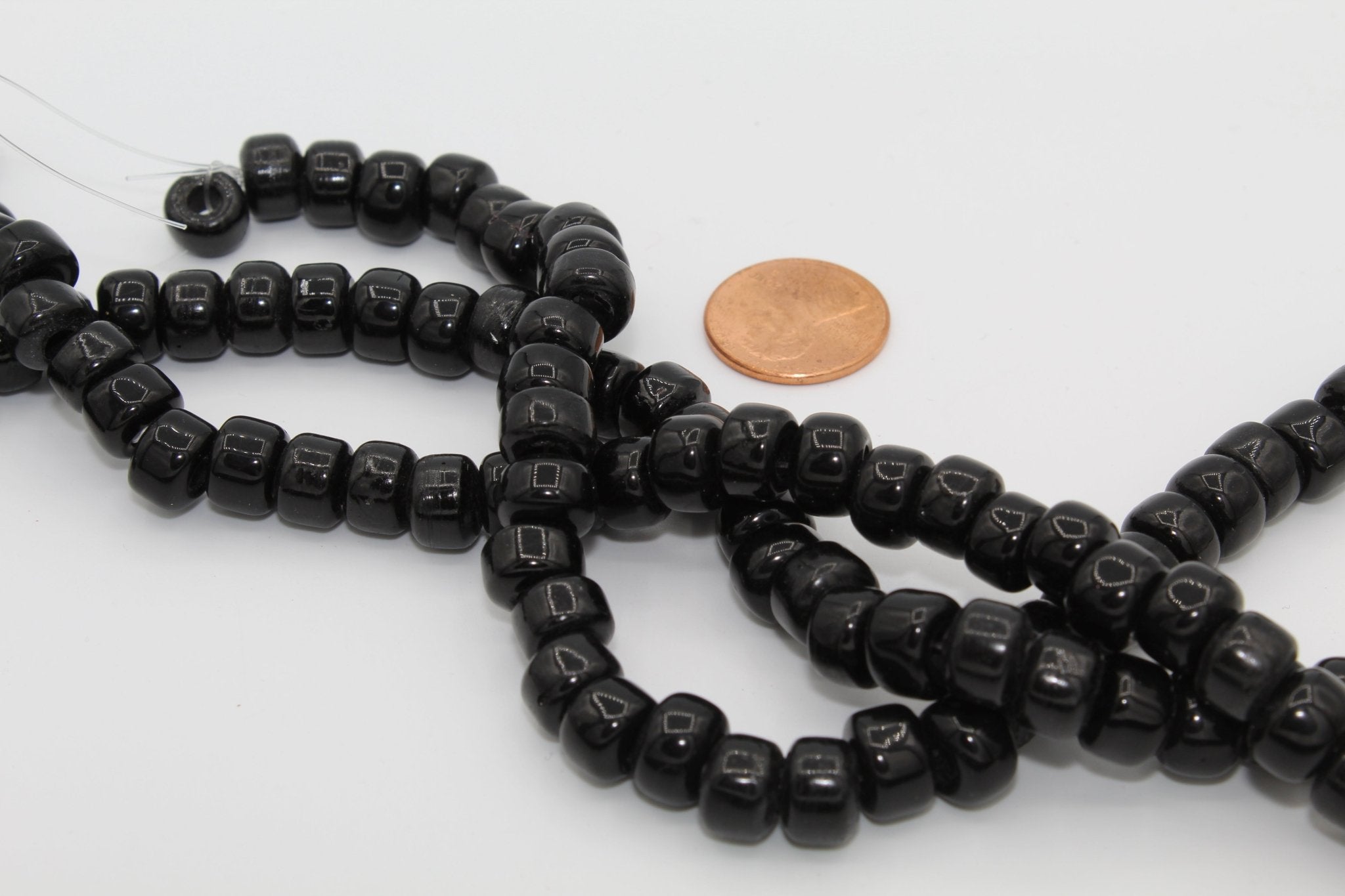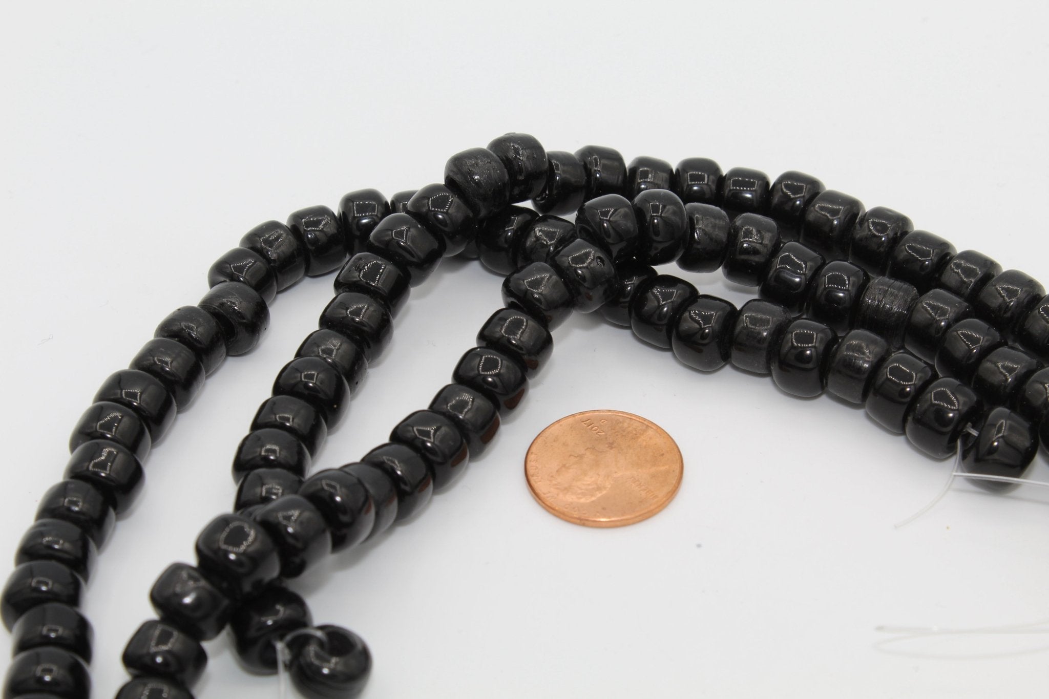 These are glass standard size Crow beads. Standard size Crow beads refer to a particular size of bead (6 x 9mm wide with a 2.5 mm hole) used in traditional Native beadwork.