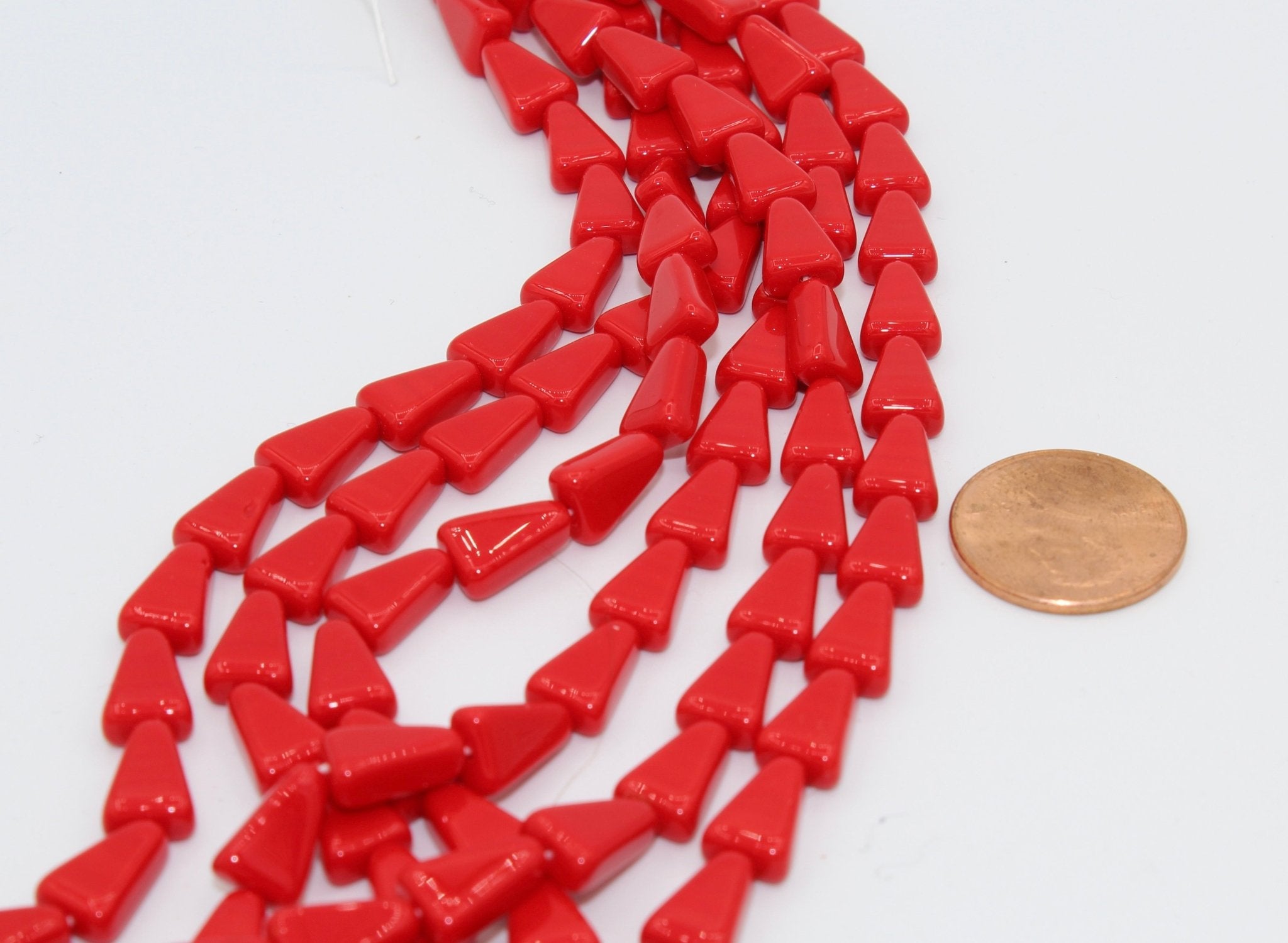 These glass triangles are 10 x 7mm (.4" x .25") with a single 1mm hole running vertically through the bead. They are sold by the strand, each of which has approximately 25 beads.