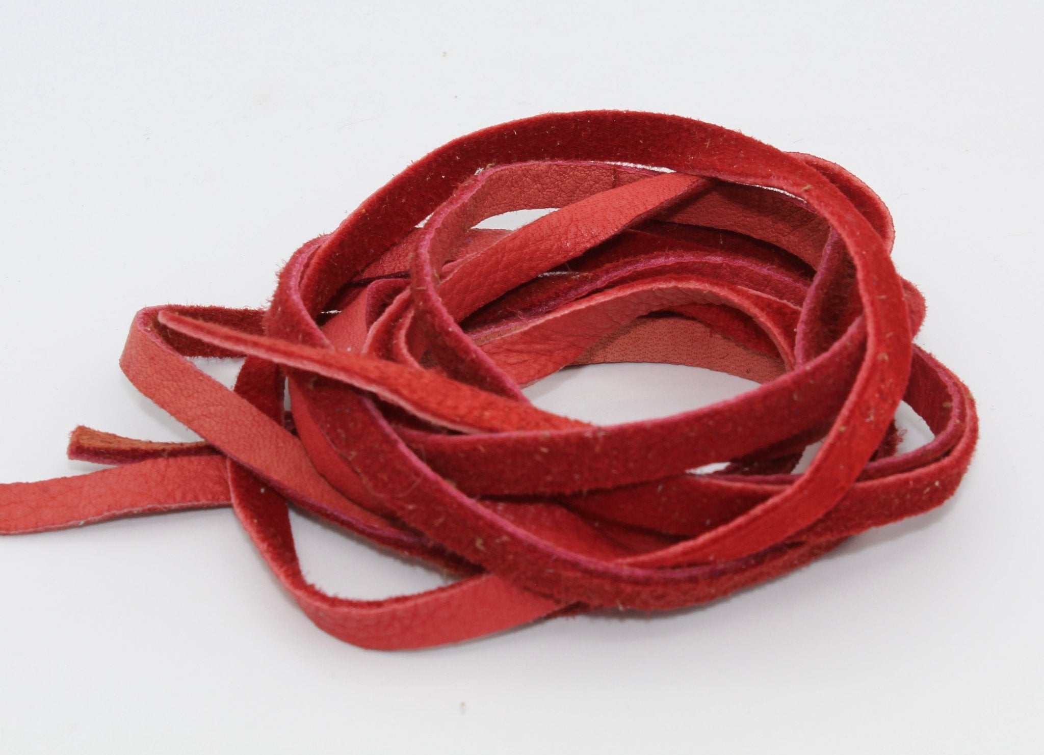 This buckskin strip is hand cut, dyed and it is approximately 42" long x 1/4" (5mm) wide x 2mm thick. Each strip has a smooth side and a rough side.